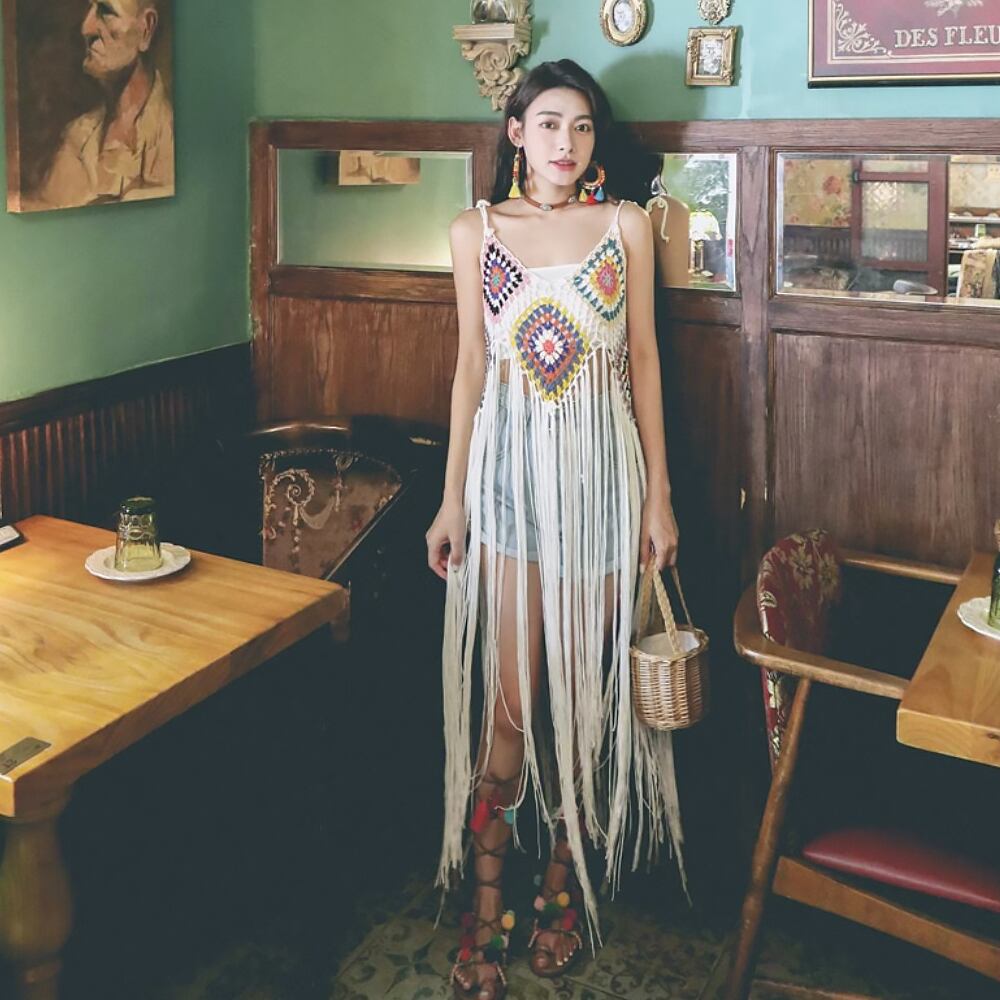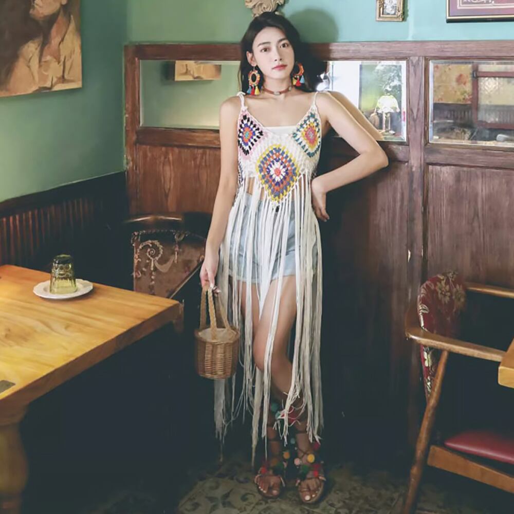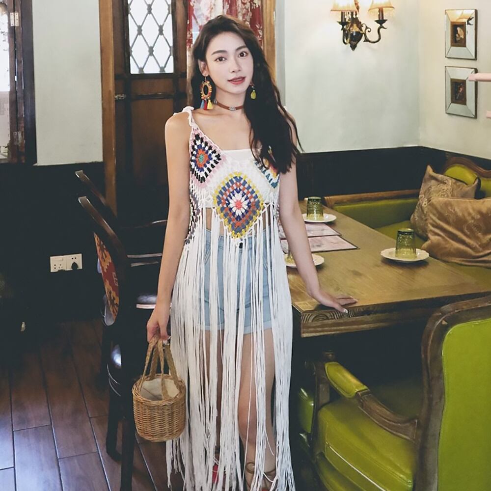 ボヘミアンニットベスト サマーニット モチーフレース編みロングタッセルベスト レース編み クロシェ編み サマーニット モチーフ編み ボヘミアン エキゾチック フォークロア トライバル ロングタッセル タッセル フリンジ ロングフリンジ バリカギ針 マルチカラー かわいい 大人可愛い きれいめ カジュアル おしゃれ レトロ 大人女子 こなれ感 ラブリー キュート 個性的 モード系 モダン 主役級 存在感 抜け感 無地 お出かけ 女子会 休日 普段使い韓国コーデ 韓国ファッション ホワイト