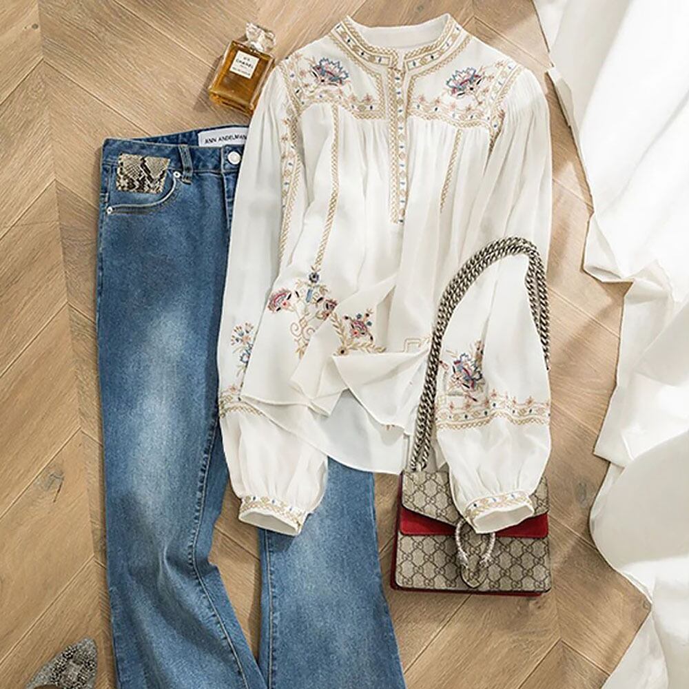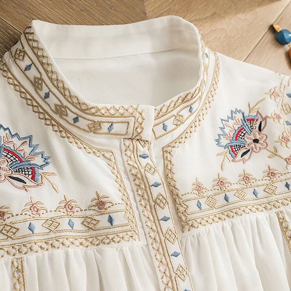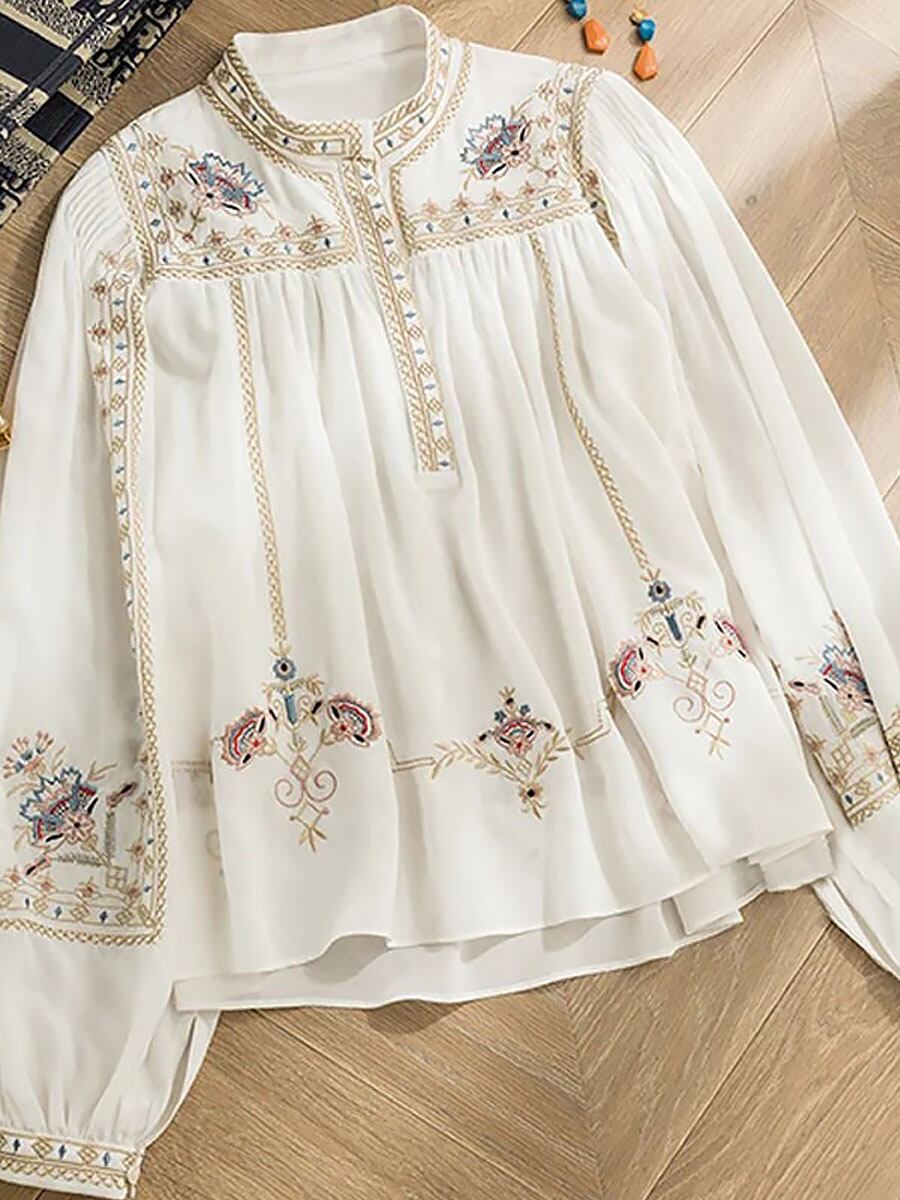 エスニック刺繍長袖ハーフボタンブラウス シャツブラウス トップス 長袖 プルオーバーラウンドネック 襟なし ノーカラー 刺繍 シフォン ふんわり バルーンスリーブ バブルスリーブ ぽわん袖 ホワイト 白 エスニック 民族柄 かわいい 大人可愛い きれいめ シンプル カジュアルおしゃれ かっこいい レトロ こなれ感 ラフ ラブリー キュート ガーリー 個性的 モダン 主役級 存在感 抜け感デート 着回し 普段使い ファッション 韓国コーデ 韓国ファッション