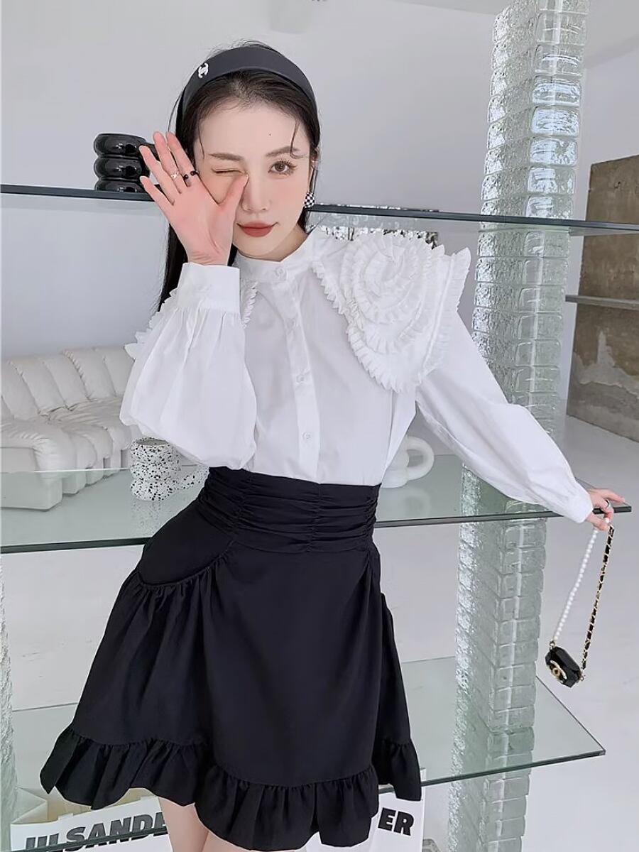フラワーモチーフアンシンメトリーブラウス 長袖 フリル ビッグカラー パフスリーブ シャツ ブラウス 白シャツ 白トップス ミディアム丈 袖あり 長袖 ボリューム袖 バブルスリーブ 萌袖 襟付き ストレート ワイド Aライン スーツインナー 前開き かわいい 大人可愛い きれいめ シンプル カジュアル 上品 おしゃれ お洒落 かっこいい レトロ 大人女子 こなれ感 ラブリー ガーリー 個性的 モード系 エレガント モダン 主役級 存在感 韓国コーデ 韓国ファッション ホワイト 白