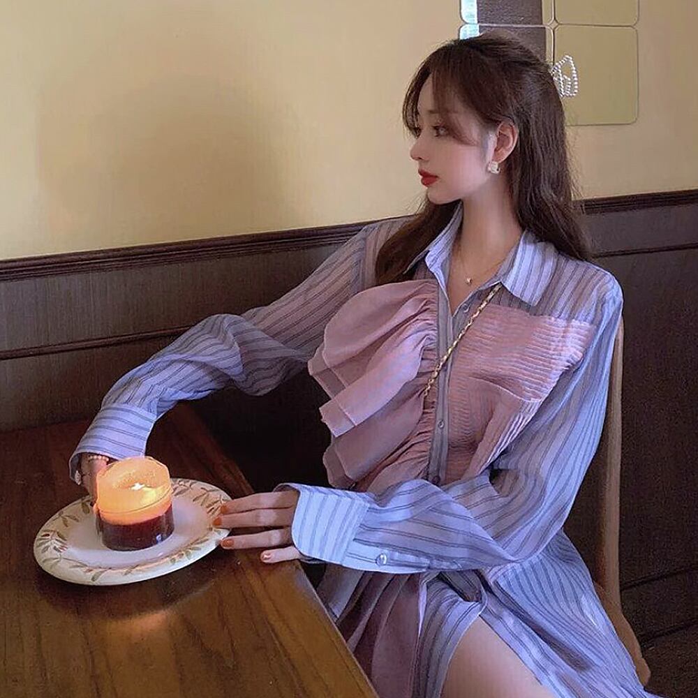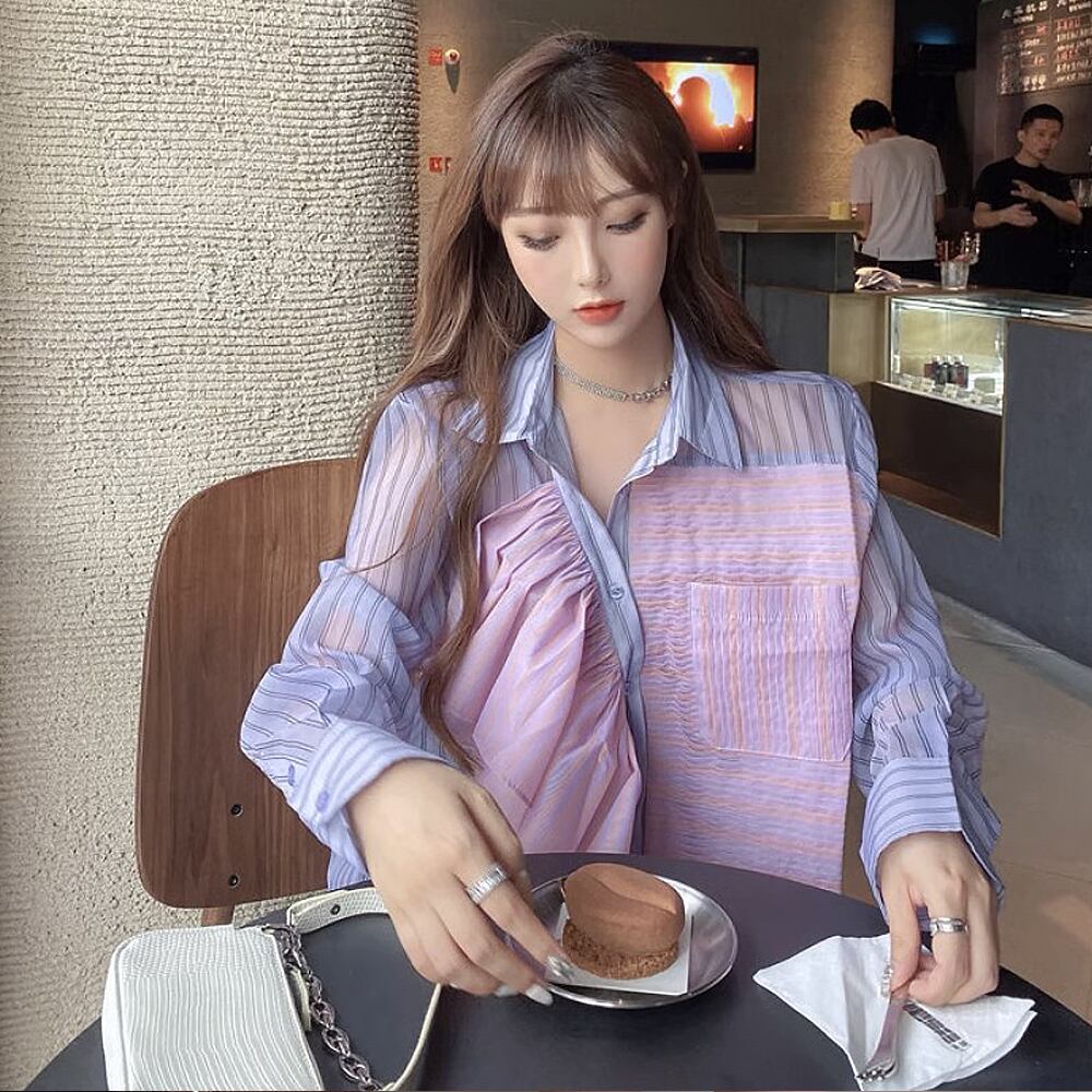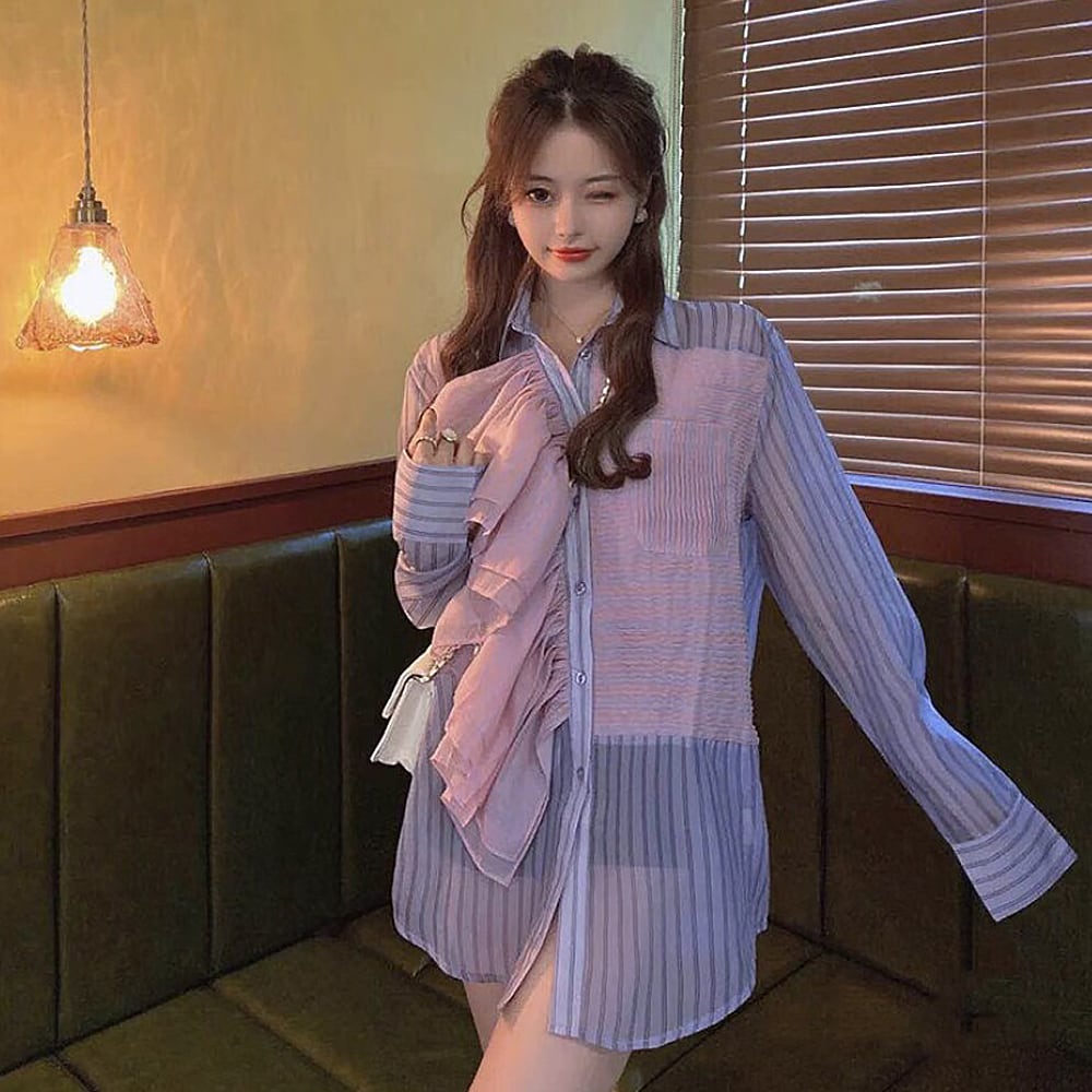 フリルタックストライプシアーシャツ シャツブラウス シアーシャツ 薄い 襟あり ストレート ワイド 切り替えデザイン ドッキング 前開き 薄手 オーバーサイズ かわいい 大人可愛い きれいめ シンプル 上品 おしゃれ お洒落 かっこいい レトロ 大人女子 こなれ感 ラブリー ガーリー 個性的 モード系 エレガント モダン 韓国コーデ 韓国ファッション パープル ピンク ストライプ
