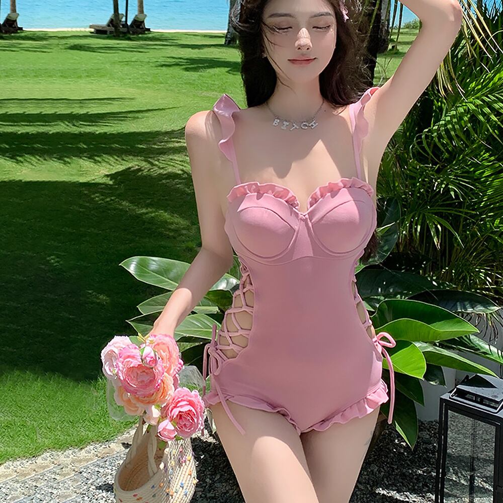 水着 サイドレースアップ 編上げ ワンピース 肩フリル 裾フリル フリル カットアウト きれいめ フェミニン かわいい ピンク パッド付き ワイヤーなし レトロデザイン コルセット風 伸縮性 胸元 谷間 谷間魅せ 盛れる オールインワン 紐 個性的 かわいい 大人可愛い きれいめ セクシー sexy 華やか おしゃれ リゾート バカンス 海 プール スタイリッシュ 美脚 脚長 韓国コーデ 韓国ファション スイムウェア パステルピンク