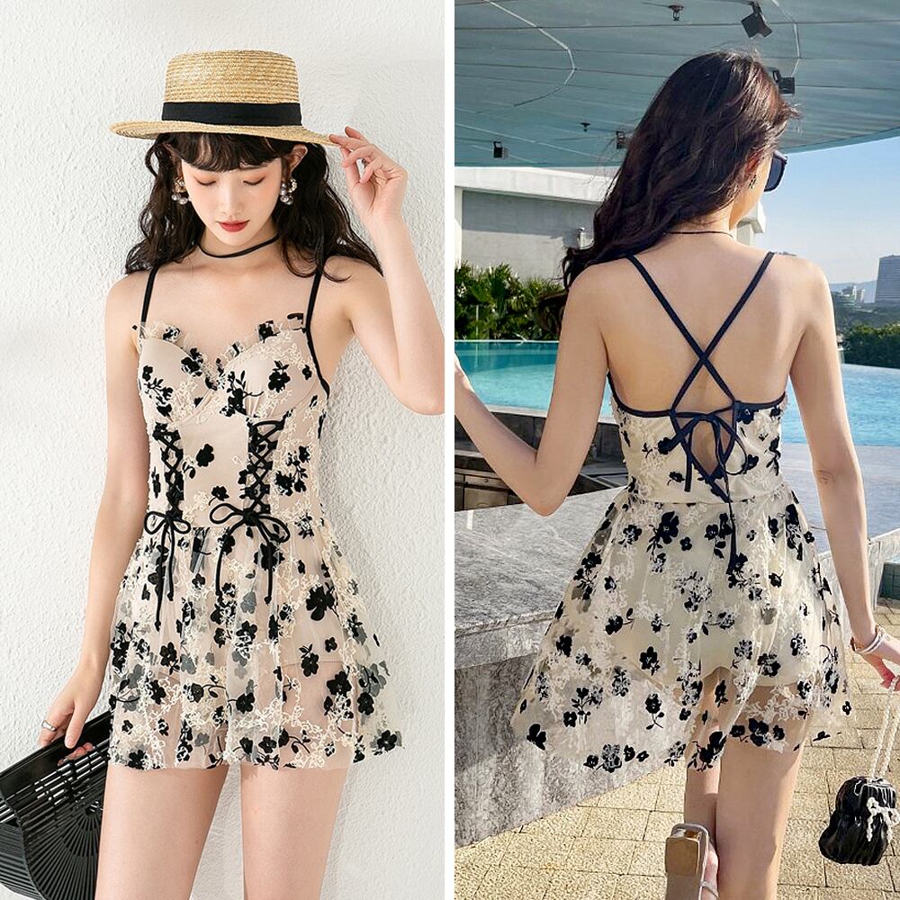 水着 ワンピース 総レース 編上げ レースアップ ミルクティーカラー 裾フリル フリル Vカット プリンセス きれいめ フェミニン かわいい 花柄レース パッド付き バッククロス レトロデザイン コルセット風 伸縮性 胸元 谷間 谷間魅せ 盛れる オールインワン 紐 個性的 かわいい 大人可愛い きれいめ セクシー sexy 華やか おしゃれ リゾート バカンス 海 プール スタイリッシュ 美脚 脚長 韓国コーデ 韓国ファション スイムウェア 薄茶 ベージュ