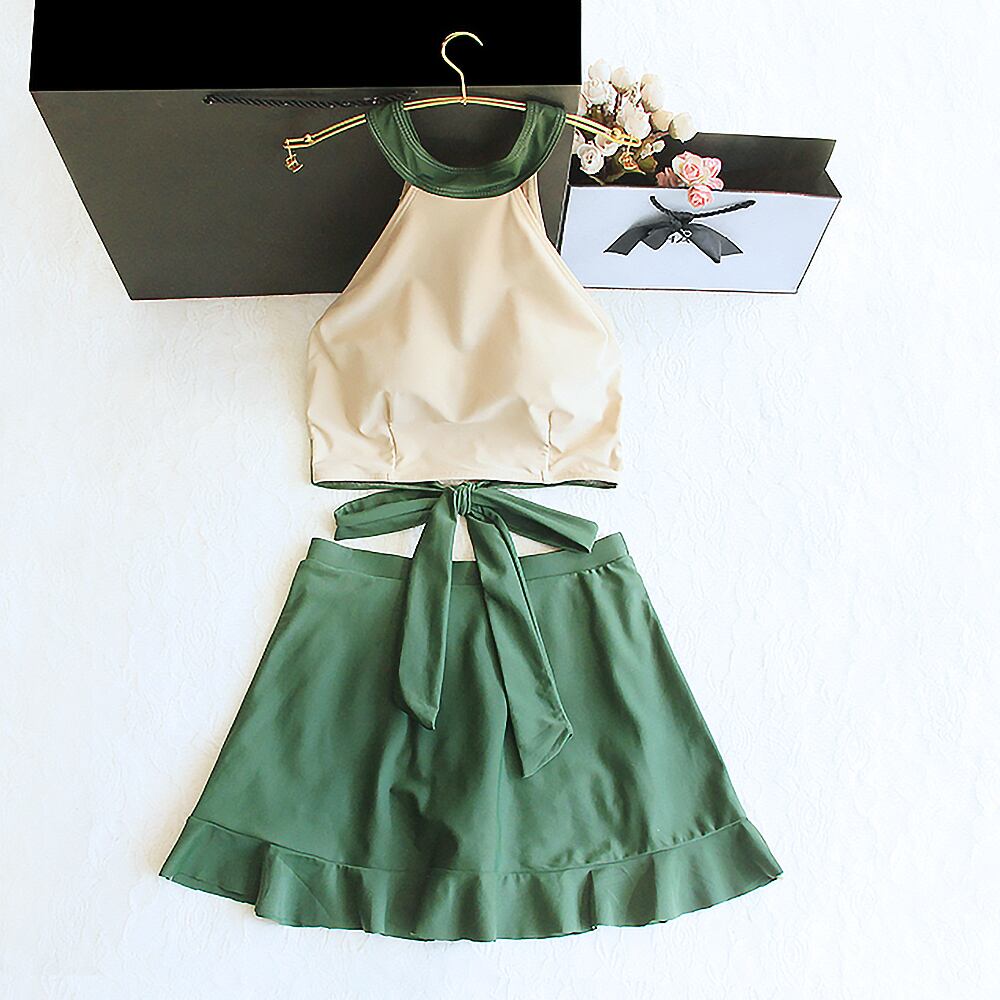 タンキニ ビキニ 水着 ホルターネック ハイネック グリーン 緑 ベージュスカートフリル バックリボン スイムウェア オープンバック 背中開き セパレート パッド付き 体系カバー ウエストリボン かわいい 大人可愛い きれいめ セクシー sexy 大人 大人っぽい おしゃれ レトロ 主役級 存在感 10代 20代 30代 40代 50代 レディース 女性用 夏 海 ビーチ プール リゾート 旅行 美脚 脚長 スタイル 高見え 格上げ モテ M L LL 大人カラー 韓国コーデ