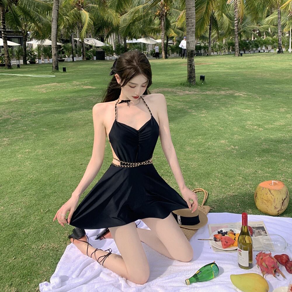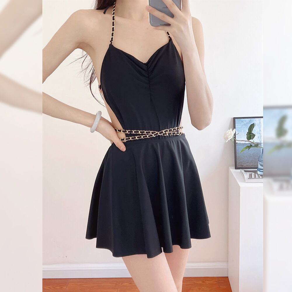2点セット 水着ワンピ+スカート パーティチェーン ワンピース モノキニ ブラック 黒 ワンピース水着 スイムウェア バックスタイル バックコンシャス パッド付き ワイヤーなし 体系カバー オープンバック ウエストマーク セクシー 大人 おしゃれ お洒落 女っぽ 個性的 無地 レディース ホテル 温泉 海 ビーチ プール リゾート 旅行 着痩せ スタイルアップ 美スタイル 韓国 韓国系 オルチャン ワントーン M L XL 韓国コーデ 韓国ファッション