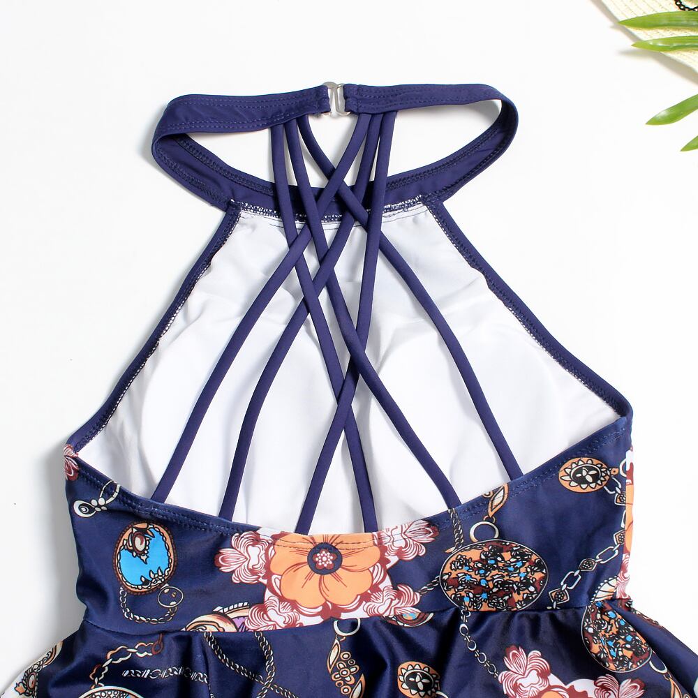 背中のストラップの交差が美しいツーピース水着、タンキニです。