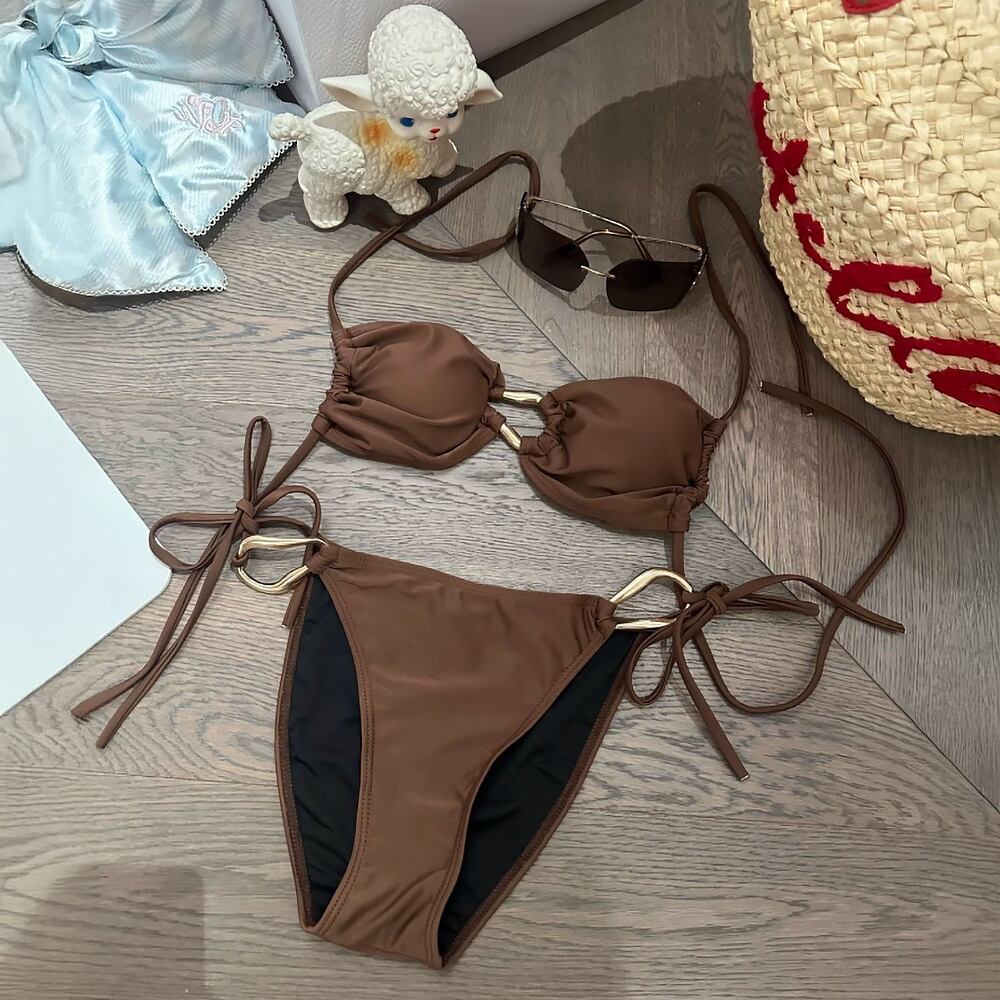 3点セット 水着 ビキニ ゴールドフロントリングビキニ上下+ティアードミニスカート レース フリル ホルターネック 紐ビキニ タイサイド タイサイドビキニ 茶色 ブラウン チェーンベルト付き フリフリ ふりふり フロントシャーリング シャーリング パット付き ワイヤーなし ノンワイヤー かわいい ガーリー 大人可愛い 大人っぽい おしゃれ ラブリー キュート レディース 女の子 海 ビーチ プール リゾート 美脚 脚長 着痩せ 韓国系 オルチャン 韓国ファション 韓国コーデ