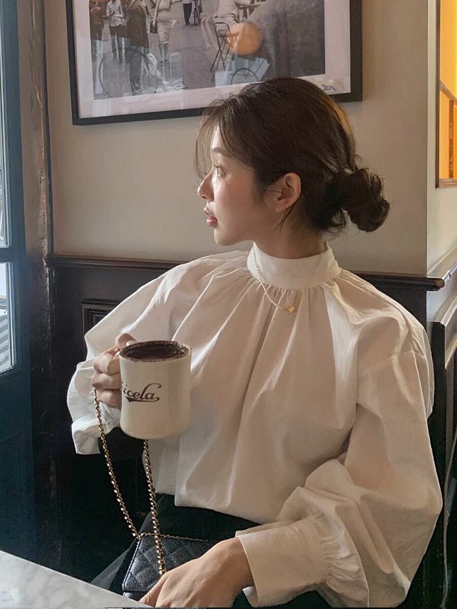 スタンドカラーバックボタンルーズブラウス シャツ ブラウス スタンドカラー 後ろボタン シャーリング トップス 白シャツ 白トップス ミディアム丈 袖あり 長袖 ボリューム袖 萌袖 フレア ワイド Aライン かわいい 大人可愛い きれいめ シンプル カジュアル 上品 おしゃれ レトロ 大人女子 こなれ感 ラブリー キュート ガーリー 個性的 クール モード系 エレガント モダン 主役級 存在感 抜け感 無地 お出かけ 着回し 韓国コーデ 韓国ファッション カーキ ホワイト