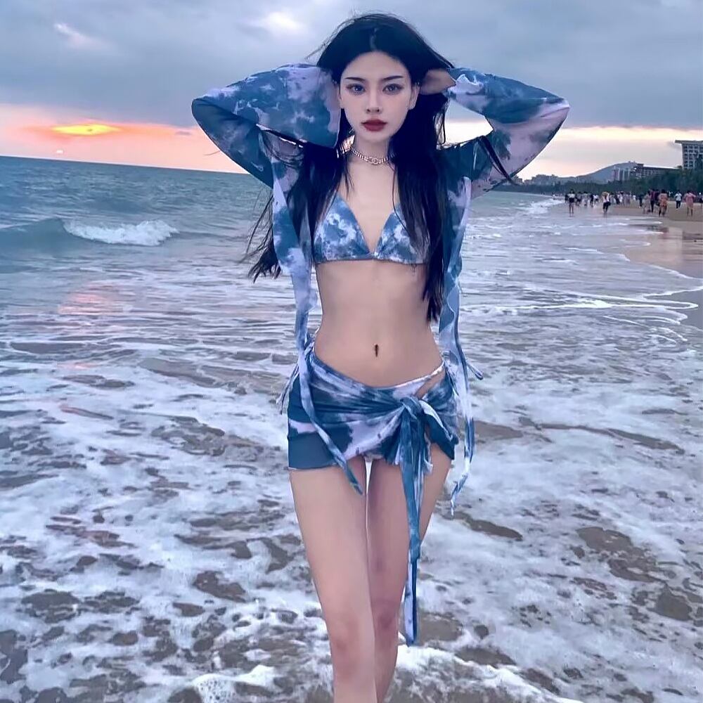 4点セット 水着 ビキニ上下+カバートップラッシュガード+パレオ ダイダイ模様 ダイダイプリント ブルー 青 ニュアンスカラー タイサイドビキニ 紐ビキニ リボン スイムウェア パッド付き ワイヤーなし レトロ モダン フェミニン セクシー シンプル 谷間寄せ 大人 おしゃれ お洒落 女っぽ 個性的 レディース ホテル 温泉 海 ビーチ プール リゾート 旅行 着痩せ スタイルアップ 美スタイル 韓国 韓国系 オルチャン S M L XL 韓国コーデ 韓国ファッション