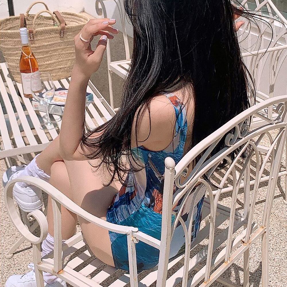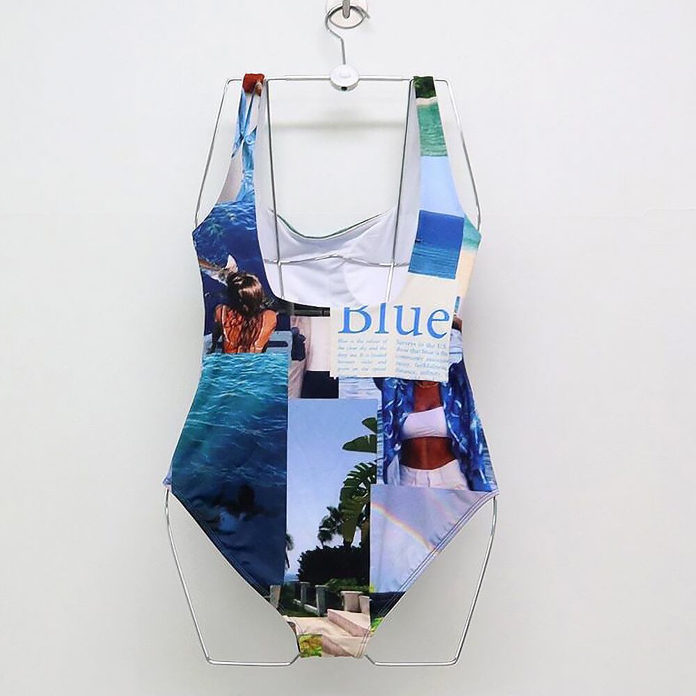 個性的な海や空の写真がランダムにプリントされたワンピース水着です。