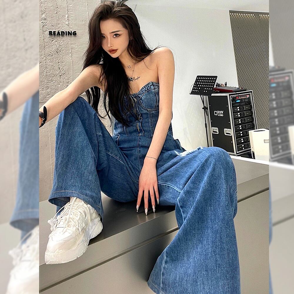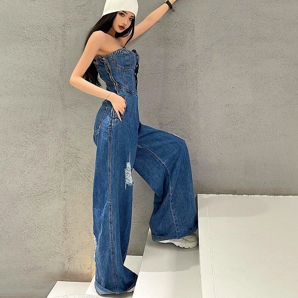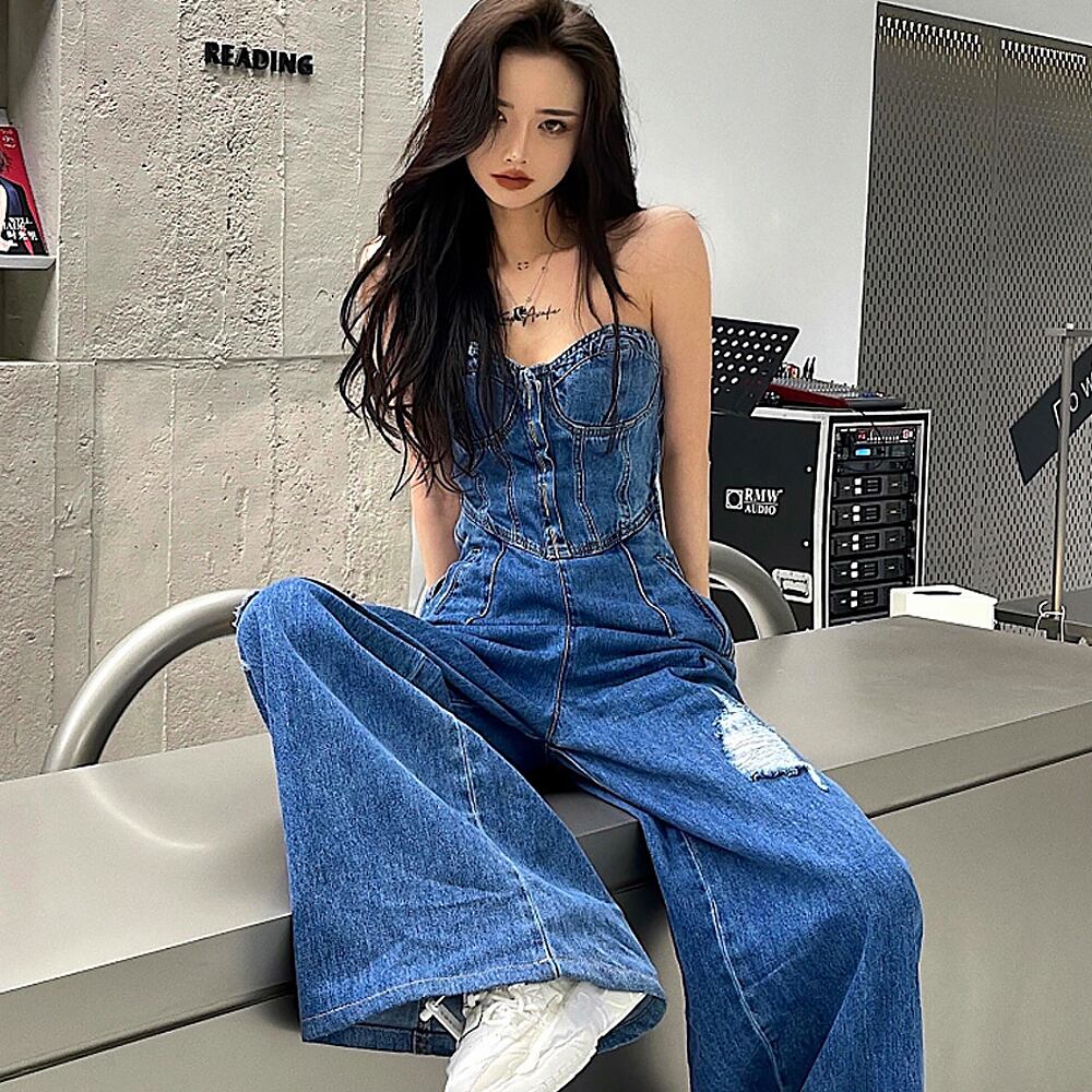 オールインワンデニム チューブトップデニムジャンプスーツ デニム つなぎ サロペット ベア ジャンプスーツ オールインワン オーバーオール ベアトップ コンビネゾン ビスチェパンツ ベルボトム つなぎ セクシー ベアトップ カジュアル ダメージ ダメージ加工 かっこいい おしゃれ 韓国系 オルチャン 韓国コーデ 韓国ファッション デニムブルー