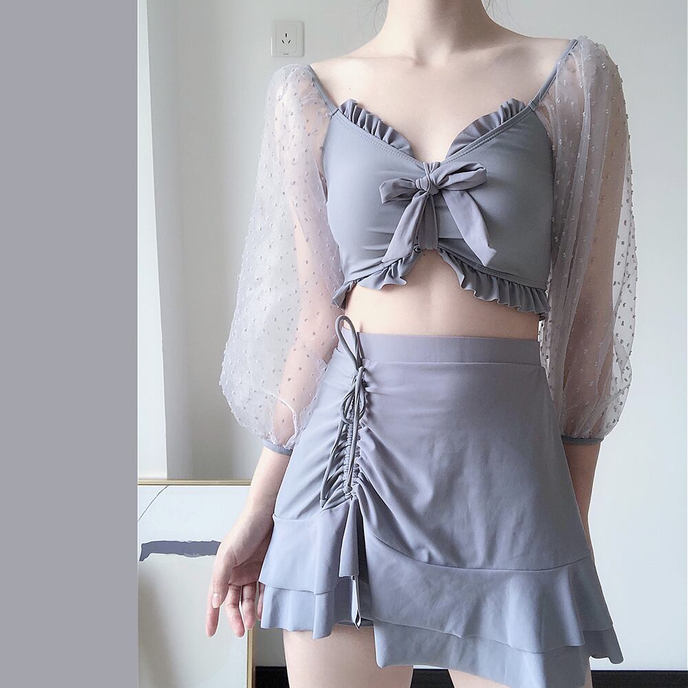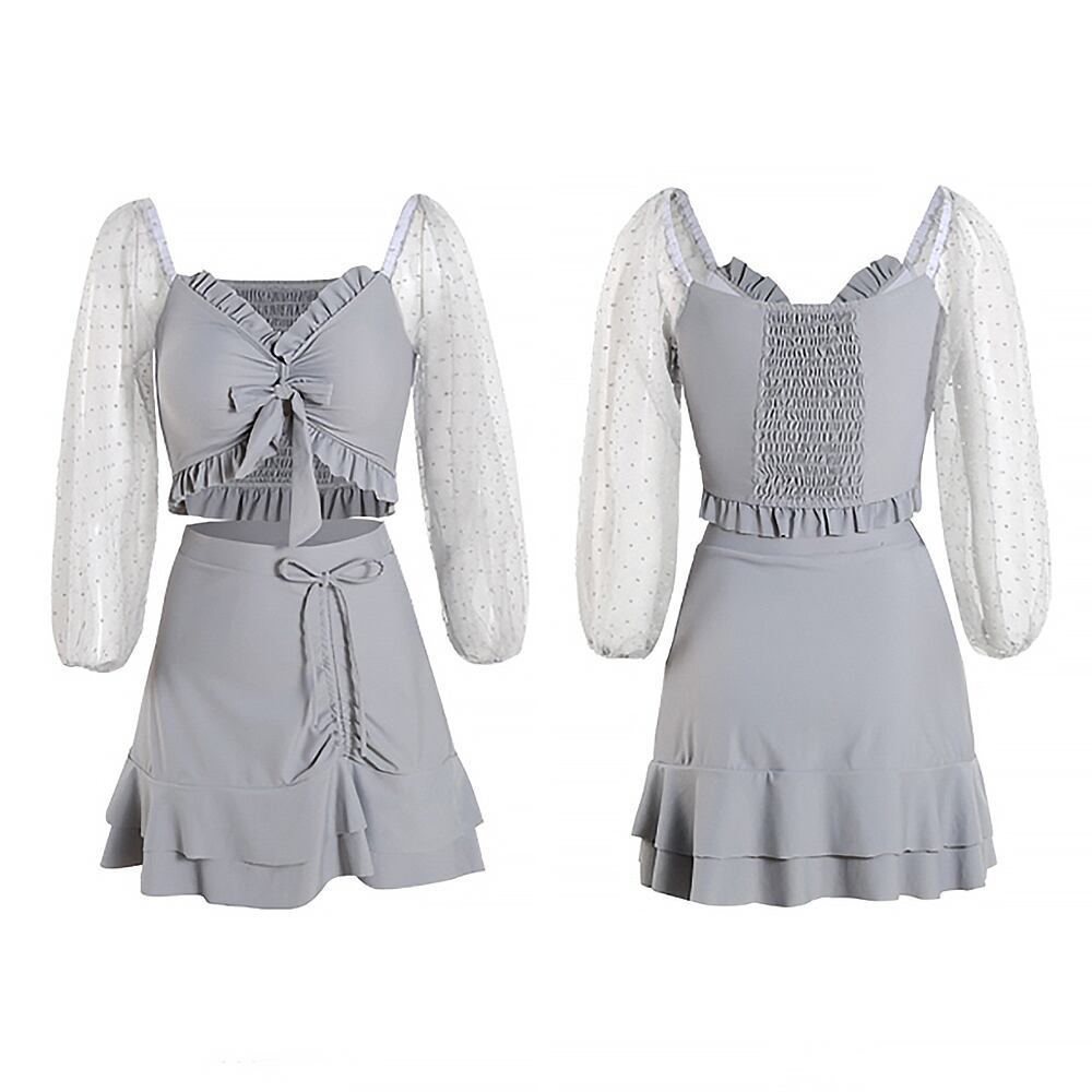 全2色 3点セット レース袖 長袖ビキニトップ+スカート+ビキニパンツ 水着 ビキニ セパレート オフショル 袖レース 背中シャーリング 露出少なめ リボン レース ドロストスカート スイムウェア セパレート パッド付き ワイヤーなし 体型カバー スリーピース かわいい 大人可愛い きれいめ セクシー 大人 大人っぽい おしゃれ 主役級 存在感 個性的 レディース 女性用 夏 海 ビーチ プール リゾート 旅行 美脚 脚長 スタイル 高見え 韓国コーデ 韓国ファション M L XL 灰色 黒 グレー