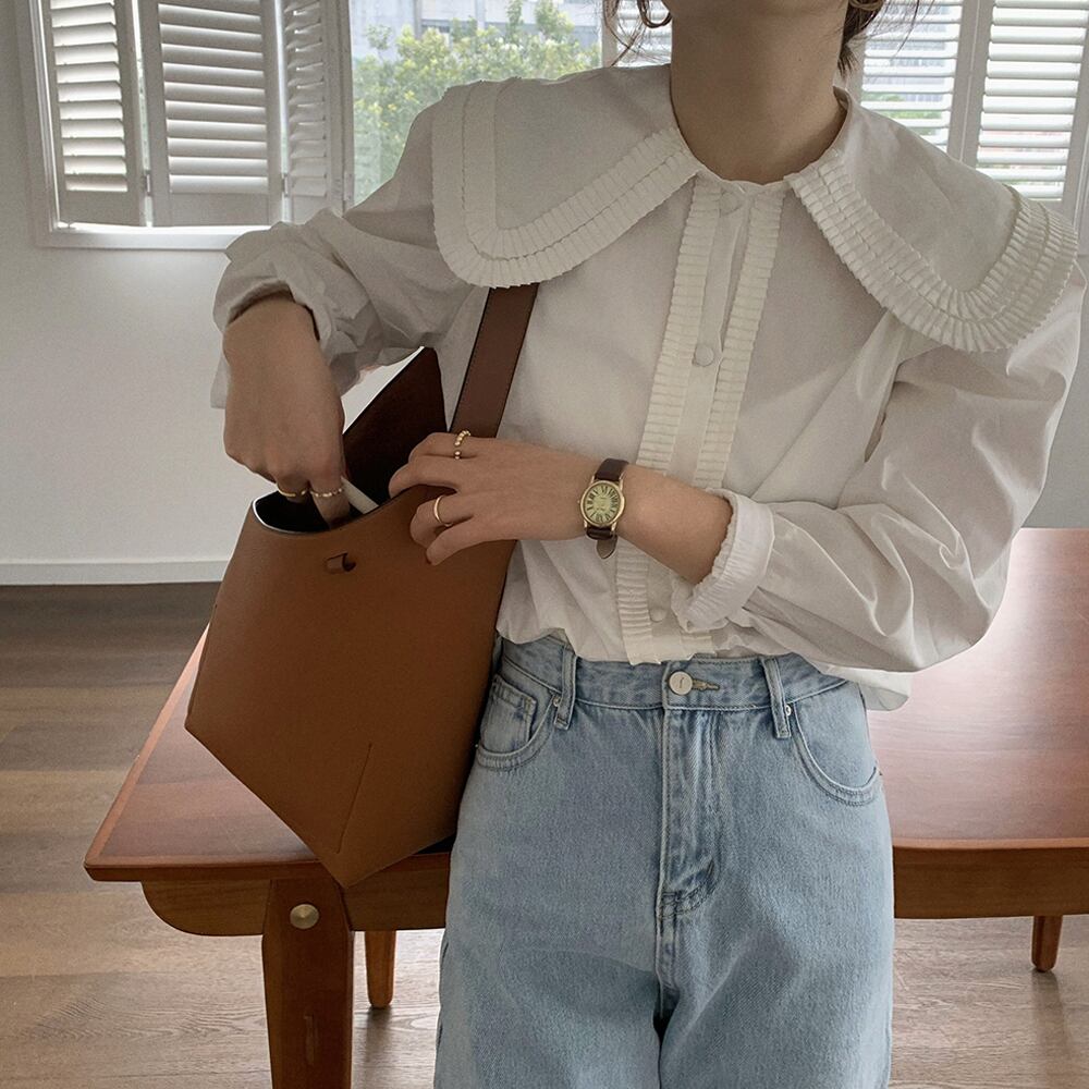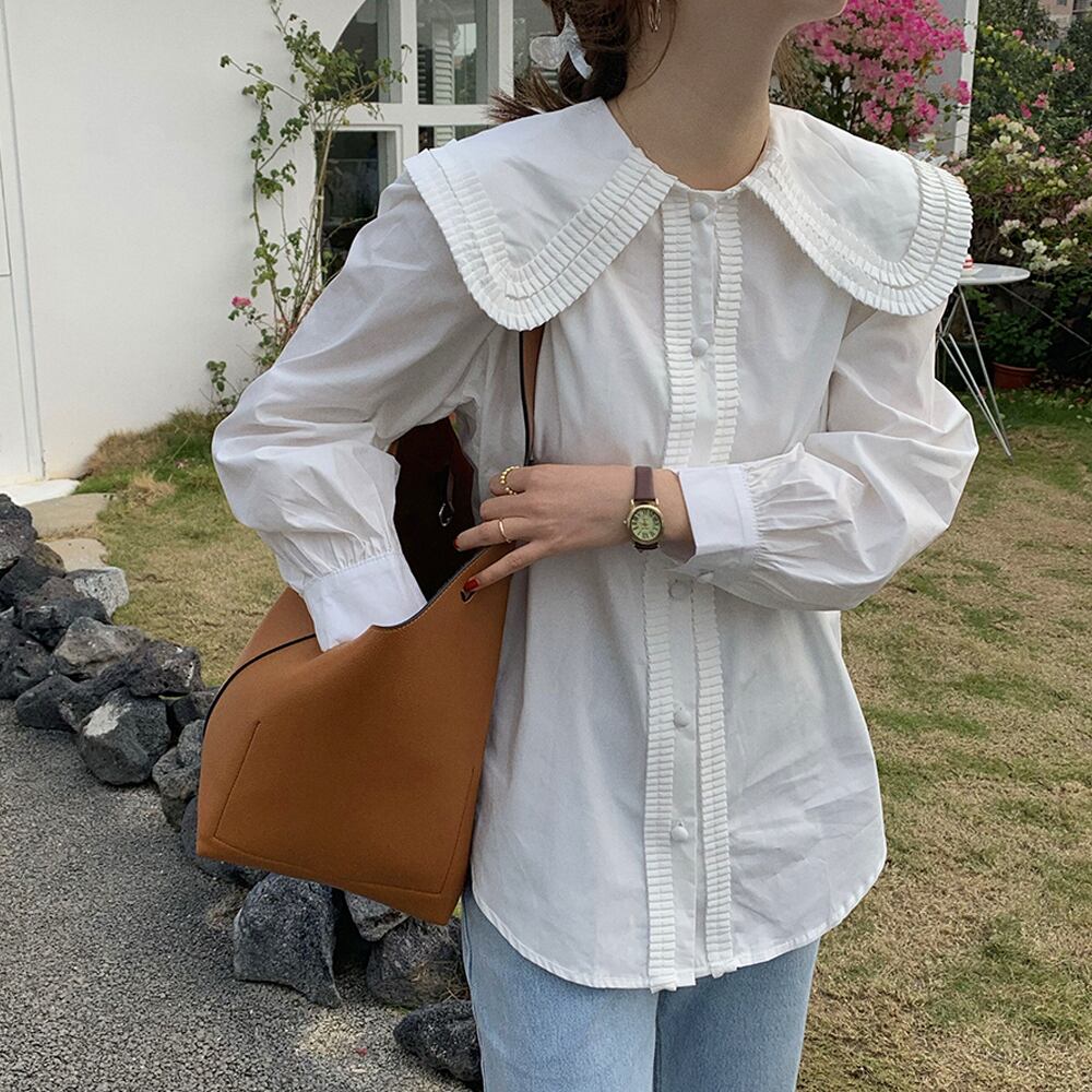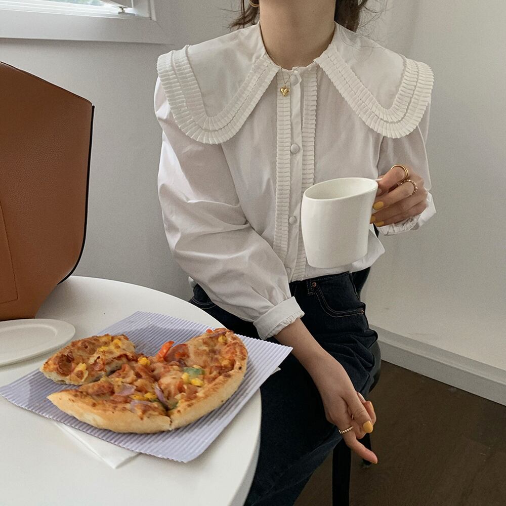 大きめの襟の縁にダブルでフリルがついたカジュアルにも使えるシャツブラウスです。
