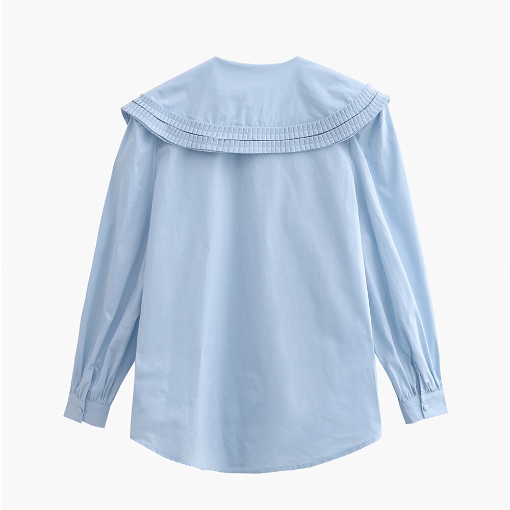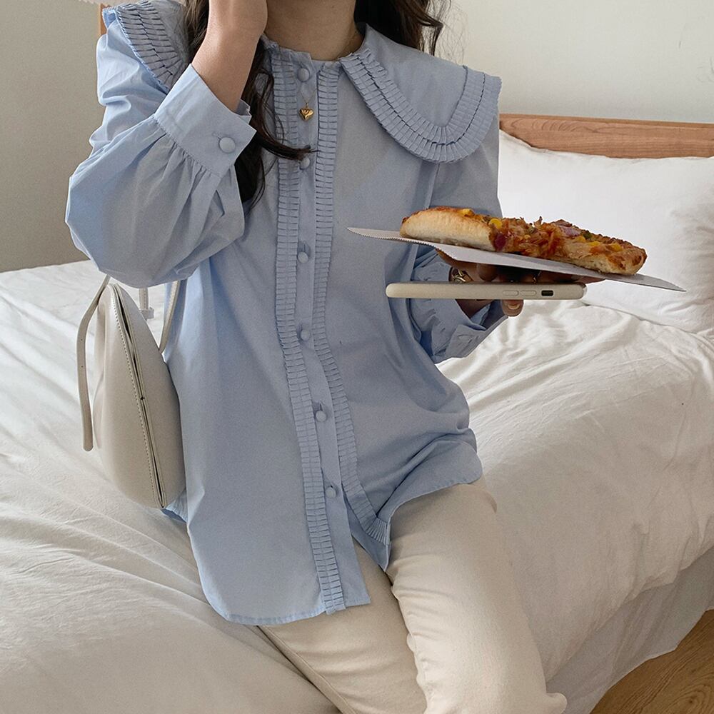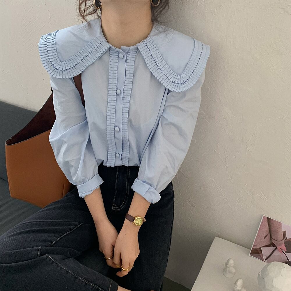 全2色 ダブルプリーツブラウス トップス ブラウス シャツ 長袖 くるみボタン 前たてフリル プリーツ エレガント フェミニン 着回し ビッグカラー 大きい襟 襟大きめ ダブルフリル 青 白 かわいい 大人可愛い きれいめ シンプル カジュアル 上品 おしゃれ お洒落 秋 冬 春 レディース OL 通勤 学生 通学 デート 普段使い 重ね着 ウエストすっきり 韓国系 オルチャン フリーサイズ 韓国コーデ 韓国ファッション