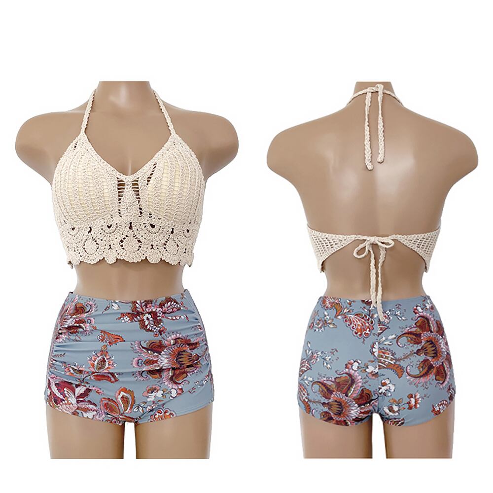 水着 クロシェットレースビキニ タンキニ かぎ針レース編み ビキニ セパレート ハイウエスト 水色 アイボリー レトロ 花柄 フラワーモチーフ エスニック柄 ホルターネック タック タック寄せボトム ギャザーボトム 全面ギャザー スイムウェア パッド付き ワイヤーなし フェミニン おしゃれ お洒落 レディース 女性用 ホテル 温泉 海 体型カバー リゾート 旅行 スタイルアップ 韓国 M L XL 韓国コーデ 韓国ファッション