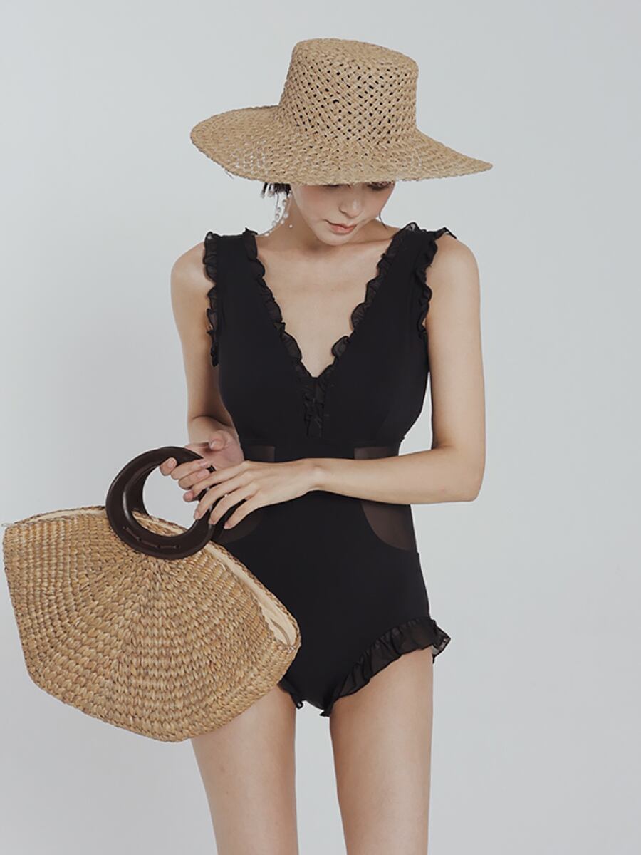 水着 肩フリルフレアワンピース モノキニ ブラック 黒 サイドシースルー 透け感 ウエストシースルー 足回りフリル バックシャン 背中美人 体型カバー スイムウェア 体型カバー パッド付き ノンワイヤー フェミニン シンプル セクシー おしゃれ お洒落 レディース 個性的 女性用 ホテル 温泉 海 ナイトプール リゾート バストアップ しっかりホールド 脚長効果 盛り 旅行 スタイルアップ 韓国 M L XL 韓国コーデ 韓国ファッション