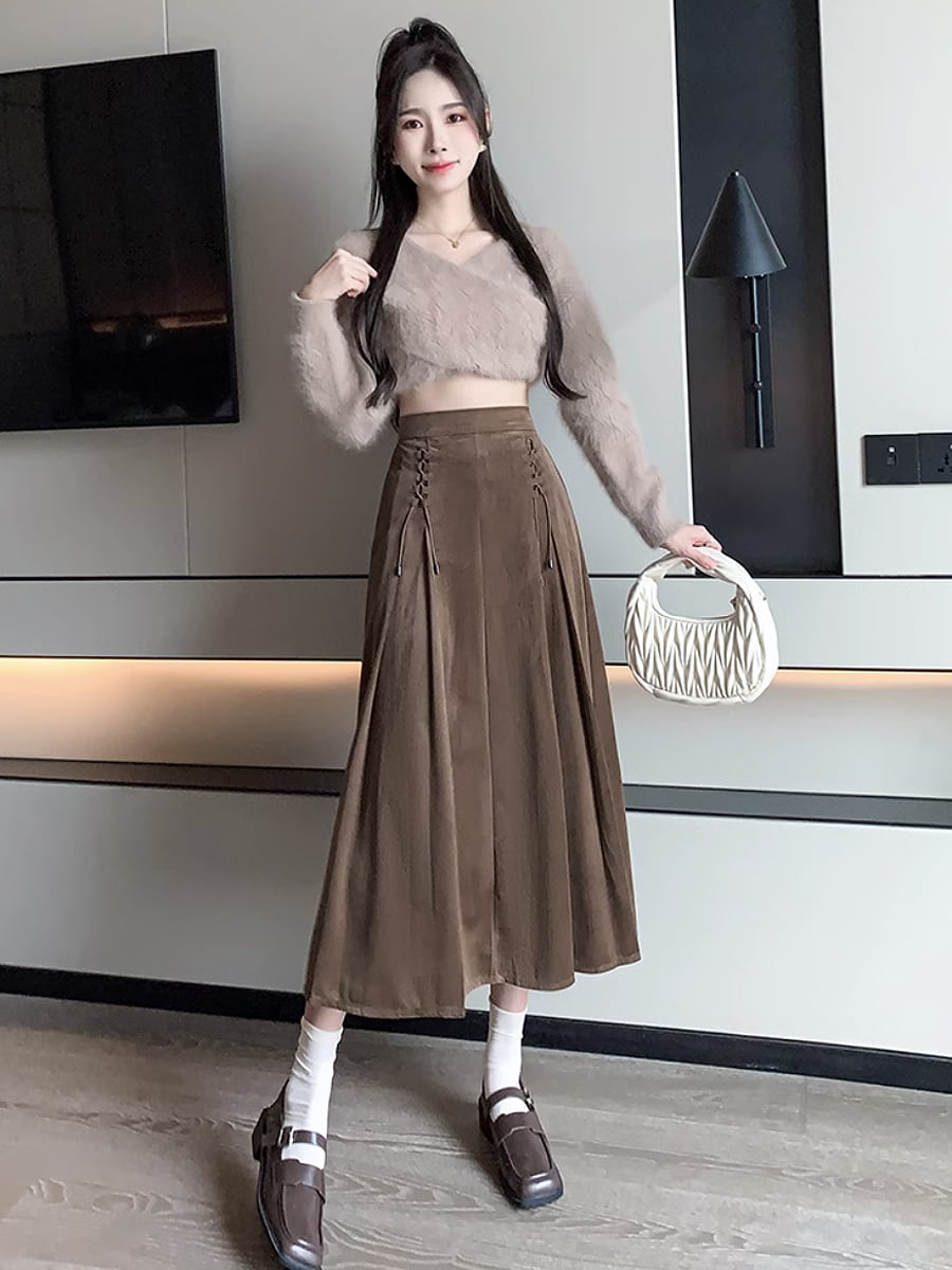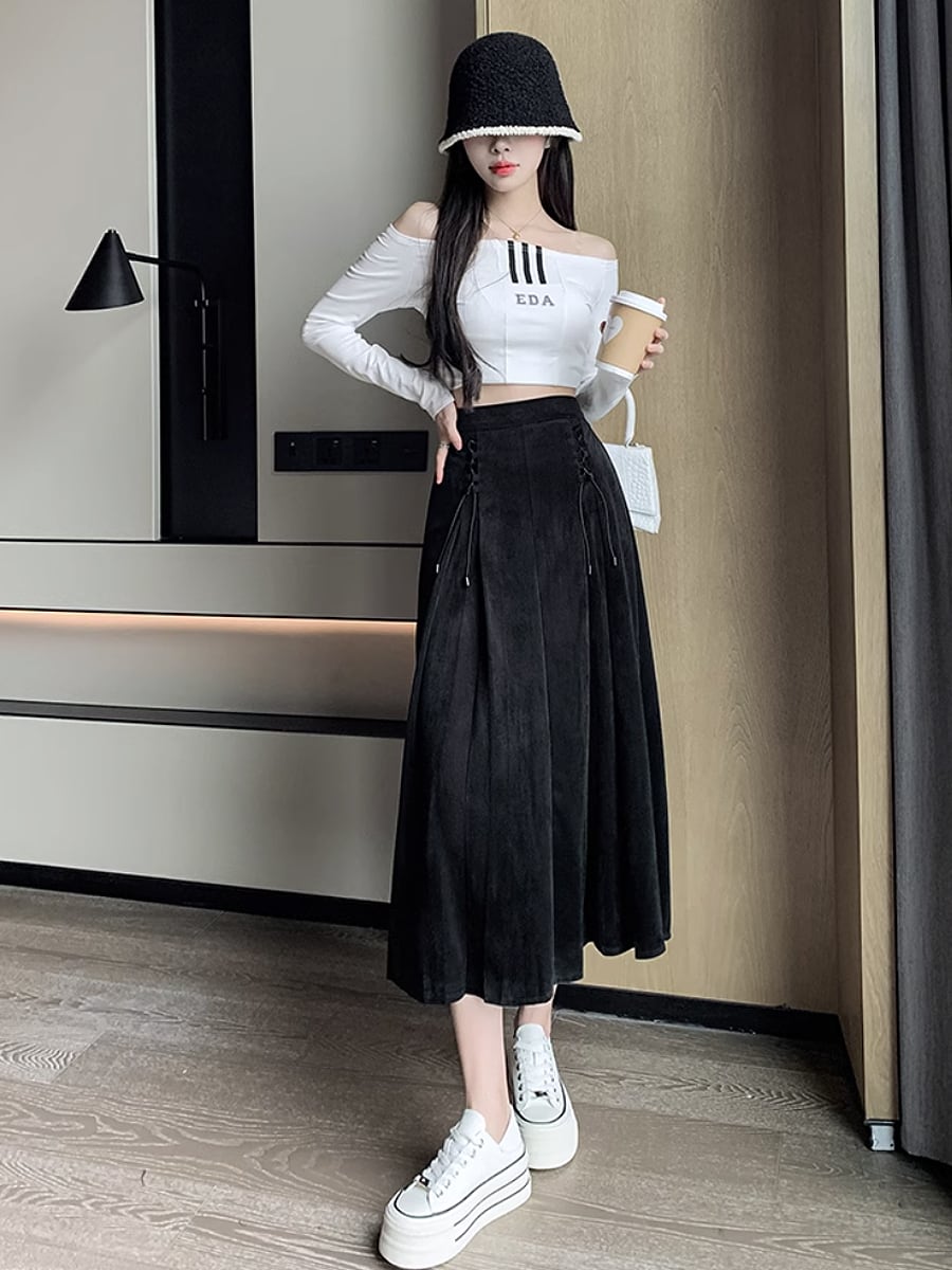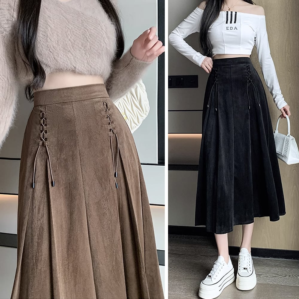 全2色 コーディロイレースアップ風ロングフレアスカート 秋冬 ロングスカート 膝下 ミモレ ミモレ丈 ロング ロング丈 Aライン プリーツ フレアスカート ハイウエスト ウエストゴム ドレープ感 大人可愛い きれいめ シンプル 大人 上品 おしゃれ レトロ 大人女子 クール エレガント 無地 秋 冬 レディース オフィス ビジネス OL 通勤 学生 通学 デート お出かけ 女子会 休日 旅行 着回し 普段使い 脚長 黒 茶色 カーキ 韓国コーデ