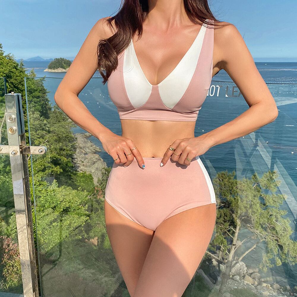 水着 スポーティツートンカラービキニ ハイウエスト ピンク ホワイト 配色 バイカラー ブラレットビキニ ブラレット ツーピース セパレート ビキニ パッド付き ワイヤーなし スタイリッシュ ガーリー キュート かわいい おしゃれ モード系 モダン ラブリー レディース 海 ビーチ プール リゾート バカンス 美脚 脚長 スタイル 高見え 格上げ モテ 韓国コーデ 韓国ファッション