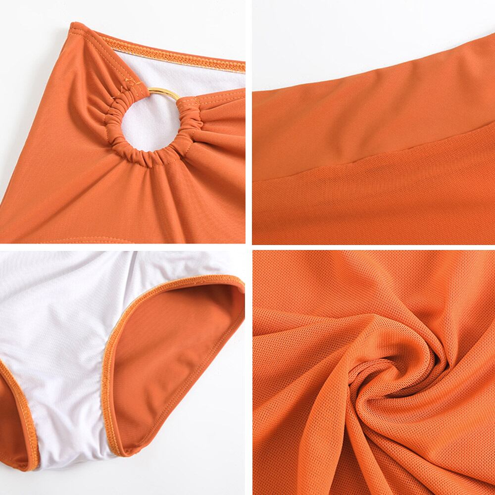 深めのV字キーホールリングが印象的なハイウエストビキニ上下とロングスカートの3点セットです。