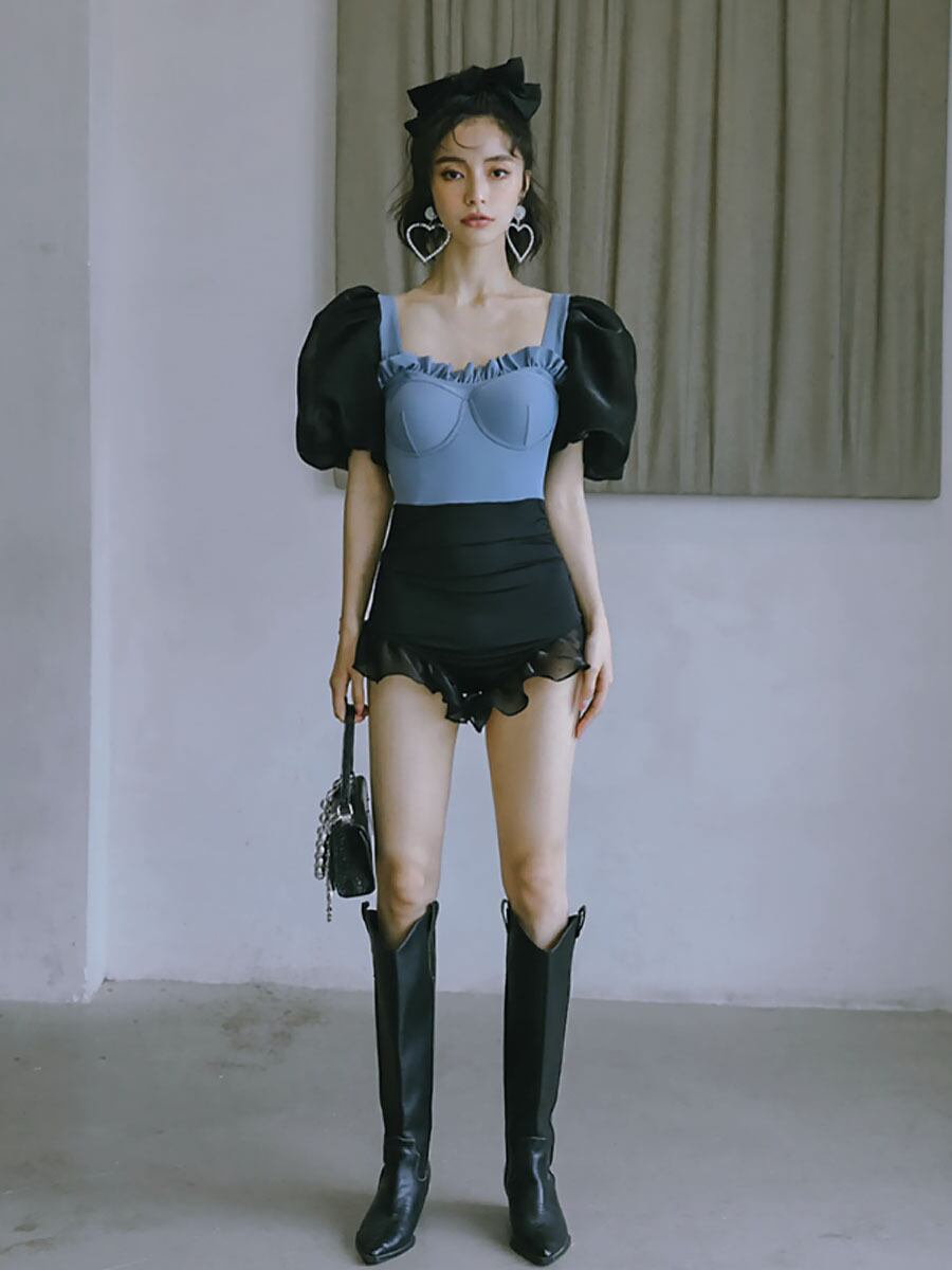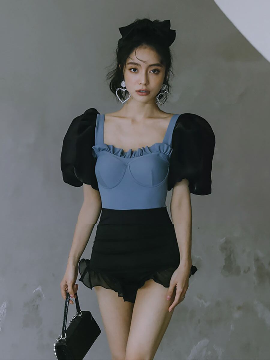 水着 袖ありヒップハートワンピース水着 半袖 五分袖 パッド付き ワイヤーあり 黒 ブラック ブルー バイカラー 配色 二の腕カバー フリル ビスチェ風 かわいい 大人可愛い きれいめ セクシー 華やか 大人っぽい おしゃれ キュート 個性的 クール モード系 スタイリッシュ レディース ビーチ プール リゾート 旅行 体系カバー 二の腕カバー 美脚 脚長 スタイルアップ 美スタイル 韓国ファッション 韓国コーデ スタイル 高見え 格上げ モテ インスタ映え