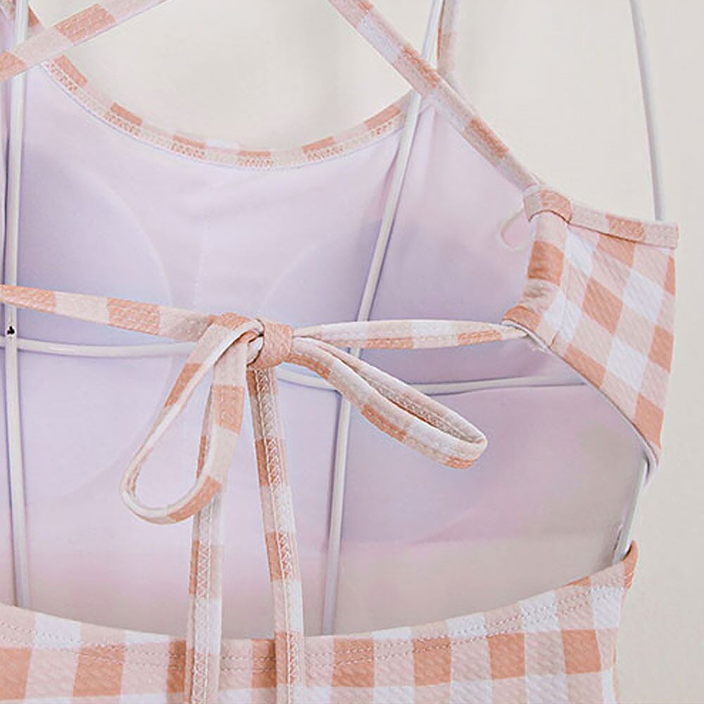 薄紅のアラバスター色のチェック柄が大人かわいいベーシックなワンピース水着です。