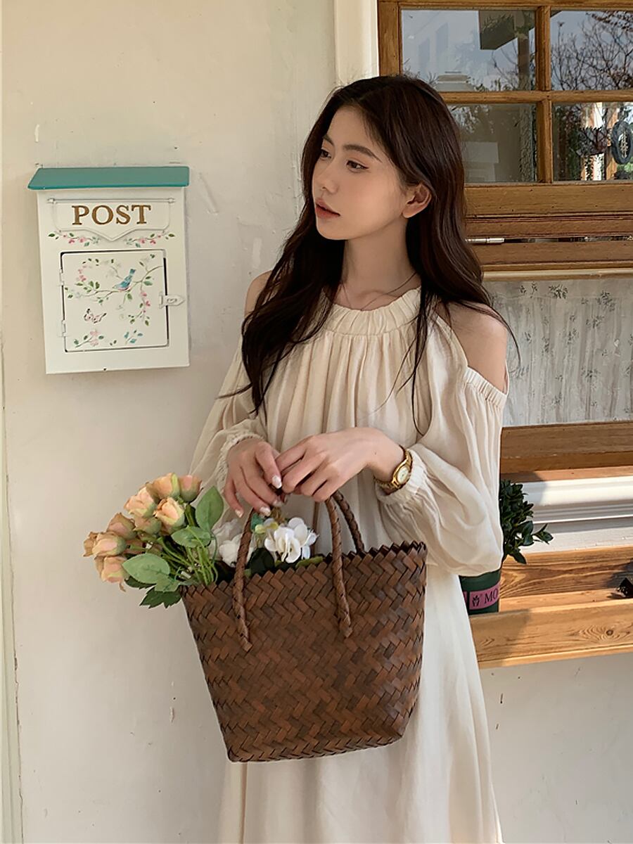 オープンショルダーロングワンピース ワンピドレス 肩出し 肩見せ ロング ラウンドネック リゾートワンピース リゾートドレス サマードレス クルーネック 襟なし フレア ワイド Aラインタック ゆったり 大人可愛い きれいめ シンプル カジュアル 上品 おしゃれ お洒落 かっこいい レトロ ナチュナル 大人女子 こなれ感 ラフ ラブリー キュート ルーズ 個性的 モード系 無地 レディース 休日 着回し 普段使い 韓国コーデ 韓国ファッション アプリコット