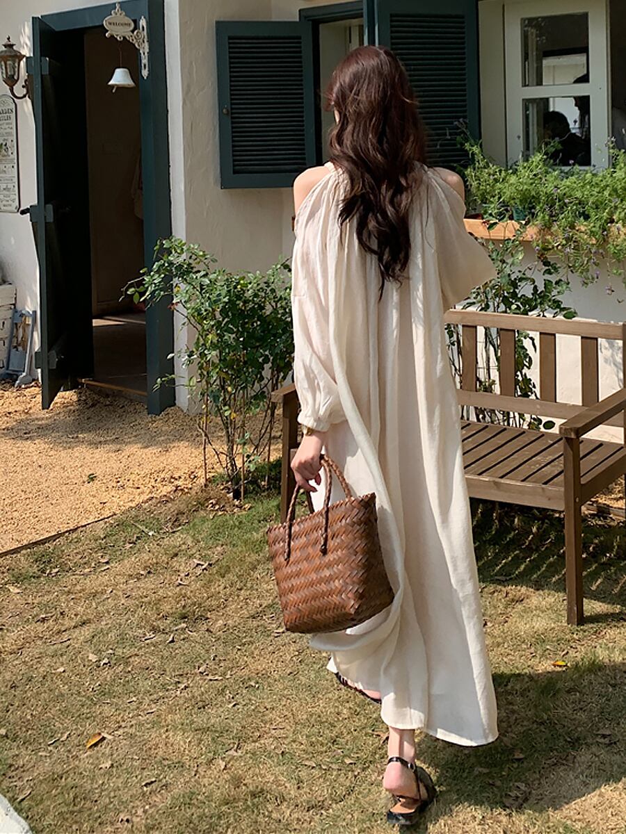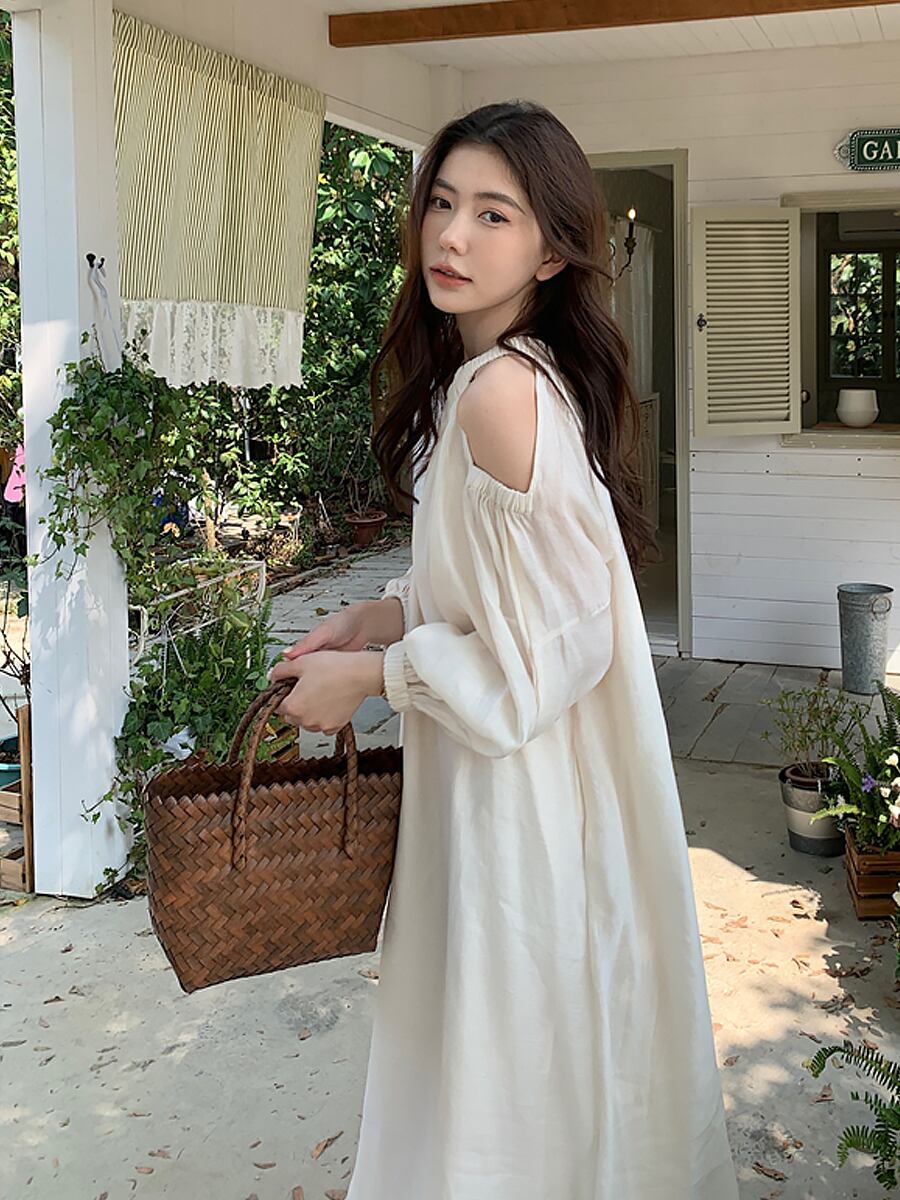 軽くてさらっと着られるオープンショルダーのロングワンピースです。