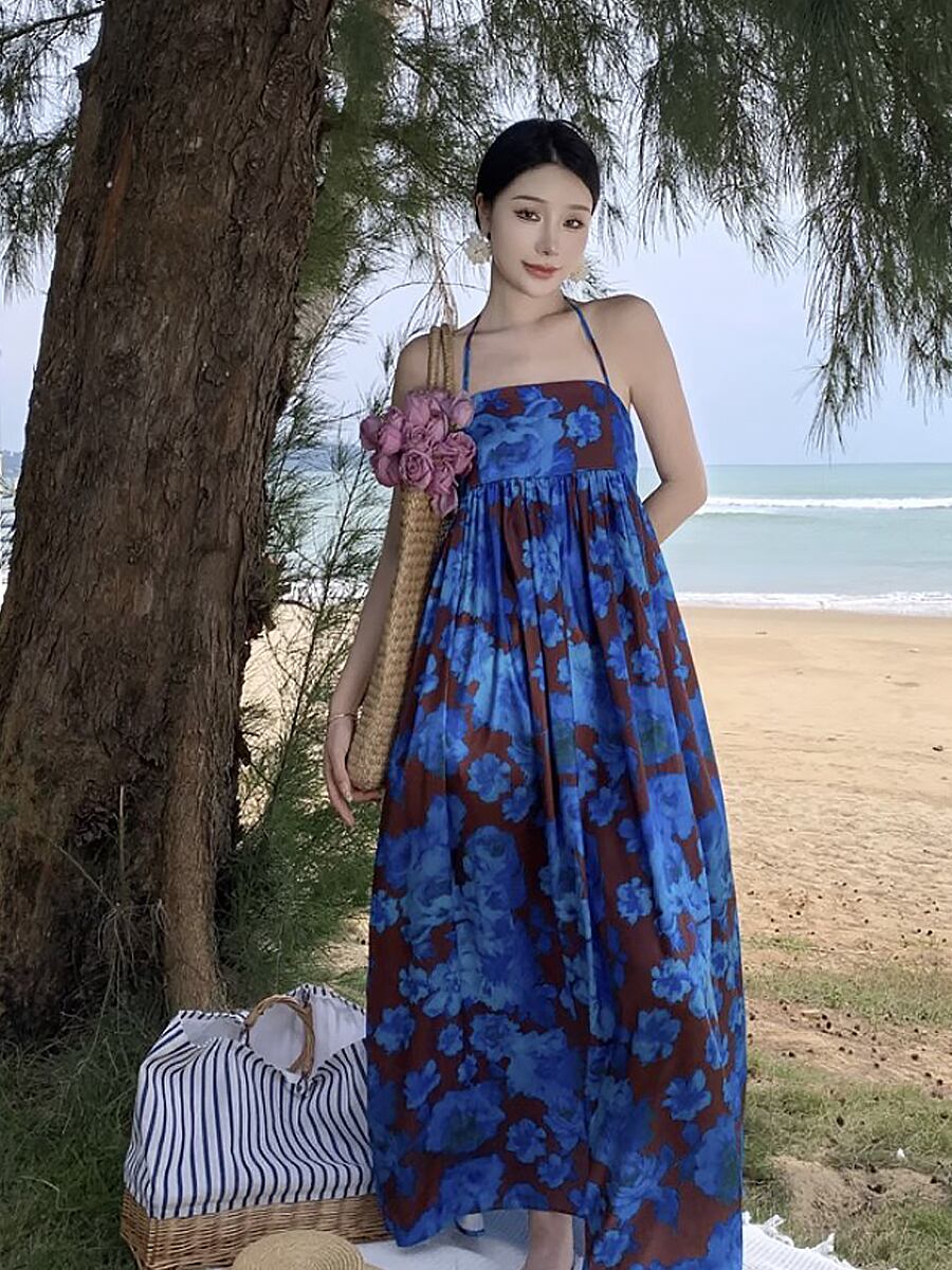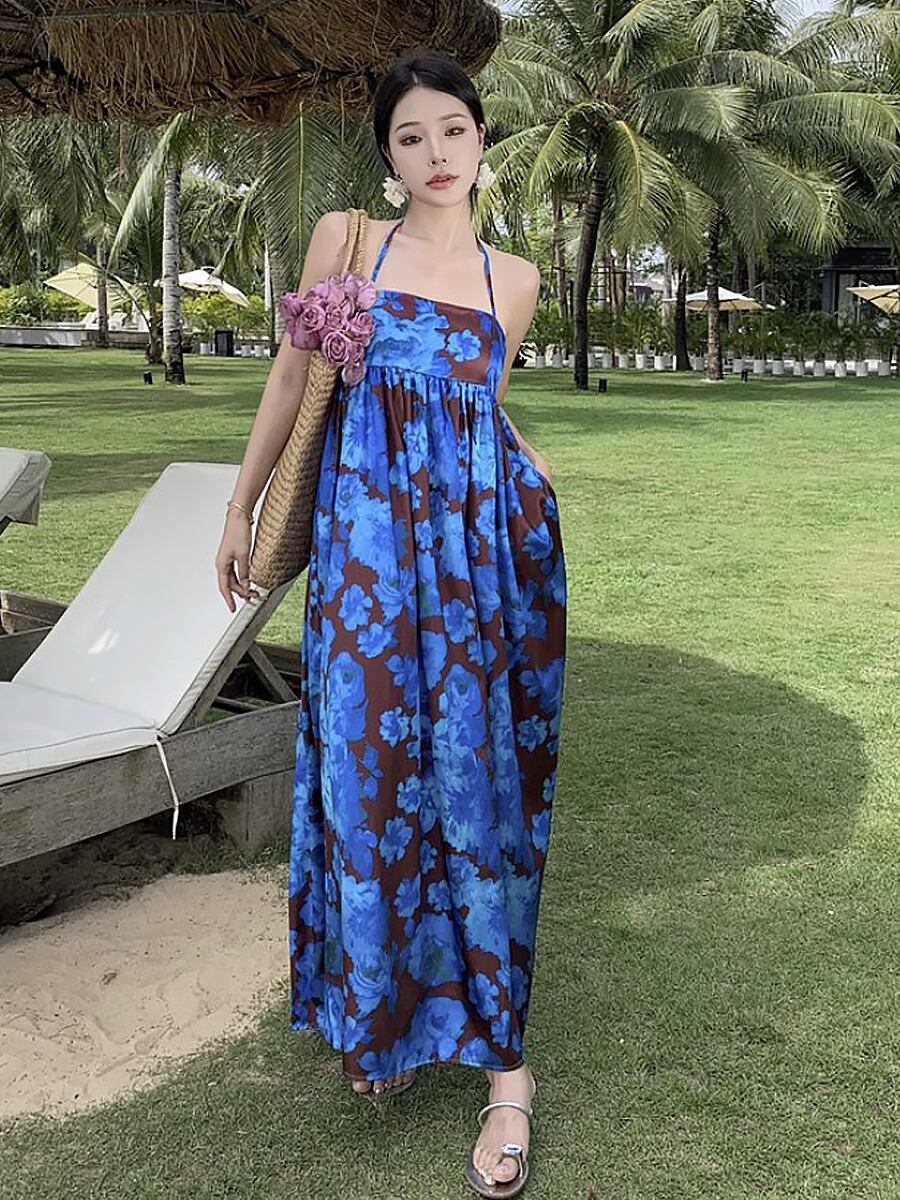 ホルターネックバックカットマキシワンピース ワンピース ドレス ブルーローズ柄 リゾートワンピース 青い薔薇 エキゾチック バックリボン 夏ワンピース 背中見せ ロング ロングワンピース Aライン ベアバック 涼しげ ゆったり 楽ちん 上品 レトロ柄 オシャレ ガーデンパーティ パーティ 大人女子 こなれ感 ラブリー キュート 体型カバー エレガント モダン 主役級 とろみ感 抜け感 お出かけ 韓国コーデ 韓国ファッション