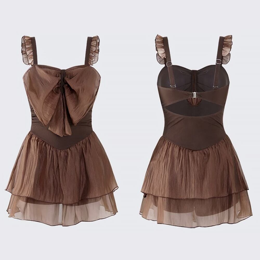水着 チュールリボンスカート付きワンピース チョコレートブラウン ブラウン チョコレートカラー 肩紐フリル ストラップフリル ウエストV字 Vカット プリンセス きれいめ フェミニン かわいい アルファベットロゴ パッド付き レトロデザイン コルセット風 伸縮性 胸元 谷間 谷間魅せ 盛れる オールインワン 紐 個性的 かわいい 大人可愛い きれいめ 華やか おしゃれ リゾート バカンス 海 プール スタイリッシュ 美脚 脚長 韓国コーデ 韓国ファション スイムウェア