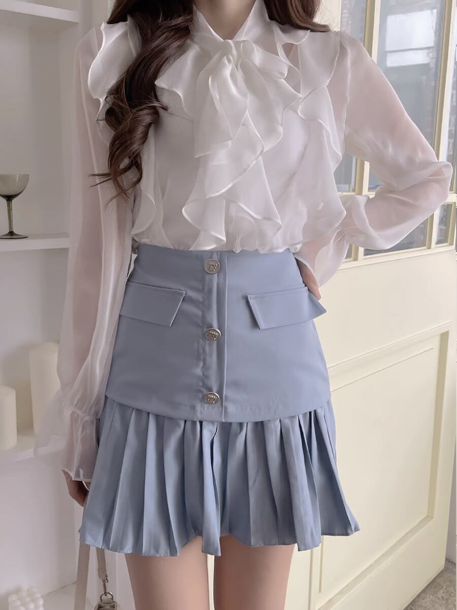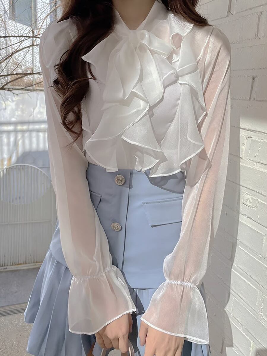 全2色 シフォンボウタイラッフルリボンフリルブラウス 袖あり 長袖 萌袖 袖口フリル シフォン シアーブラウス 透け感 大人セクシー かわいい 大人可愛い シンプル カジュアル 大人 上品 おしゃれ お洒落 大人女子 こなれ感 ガーリー 無地 春 秋 レディース 通勤 通学 デート リゾート 旅行 高原 着回し 普段使い 重ね着 楽ちん モテ 体系カバー 韓国コーデ 韓国ファッション ホワイト グレー