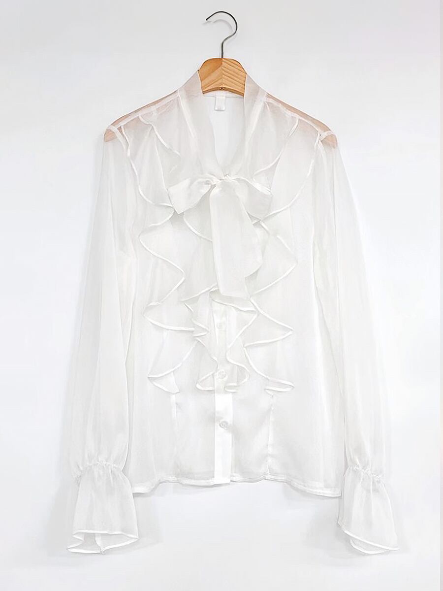 大きめのリボンと流れるようなラッフルリボンが印象的なシアーブラウスです。