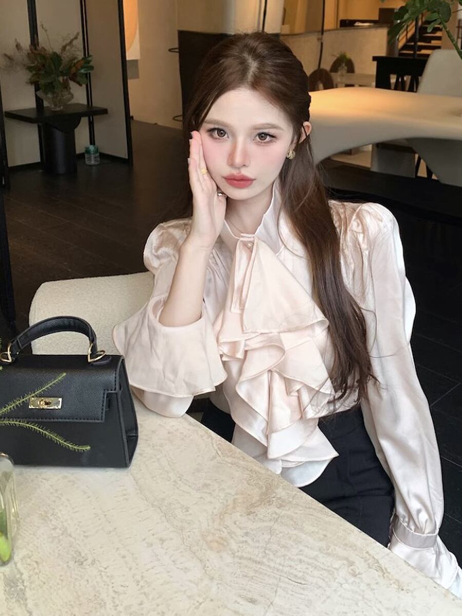 ラッフルリボンバブルスリーブシャツブラウス 長袖 ボウタイブラウス ボウタイ ラッフルリボン 流れるリボン リボンタイ シャツブラウス ブラウス リボン とろみ感 シフォン ドレッシー エレガント きちんと感 白 黒 オフホワイト ベーシック かわいい 大人可愛い きれいめ シンプル カジュアル 大人 上品 おしゃれ 大人エレガント 美しい ストライプ レディース 学生 デート 通勤 謝恩会 お出かけ お呼ばれ 着回し モテ 韓国コーデ 韓国ファション シャンパンカラー クリーム色