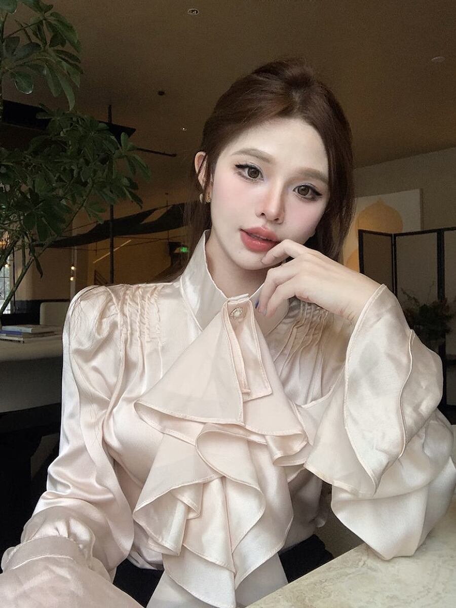 リボンが流れるように垂れているラッフルリボンの長袖ブラウスです。