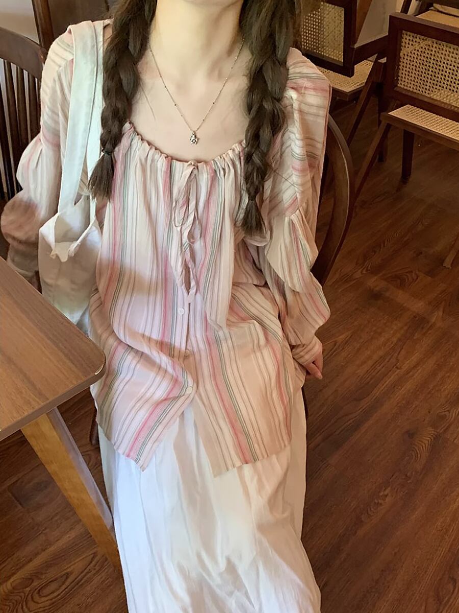 ストライプシプシーブラウス ペザントブラウス エスニック ボヘミアン フォークロア ナチュラル ブラウス ギャザー パフスリーブ ゆったり 袖口ギャザー ラウンドネック リボン 萌袖 長袖 シャツブラウス シック フェミニン カジュアル かわいい 大人可愛い きれいめ シンプル 大人 おしゃれ レディース 学生 デート お出かけ お呼ばれ 着回し モテ 韓国コーデ 韓国ファション 秋色