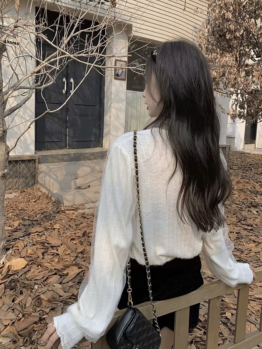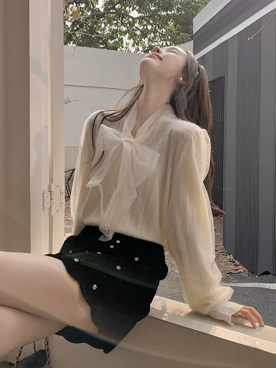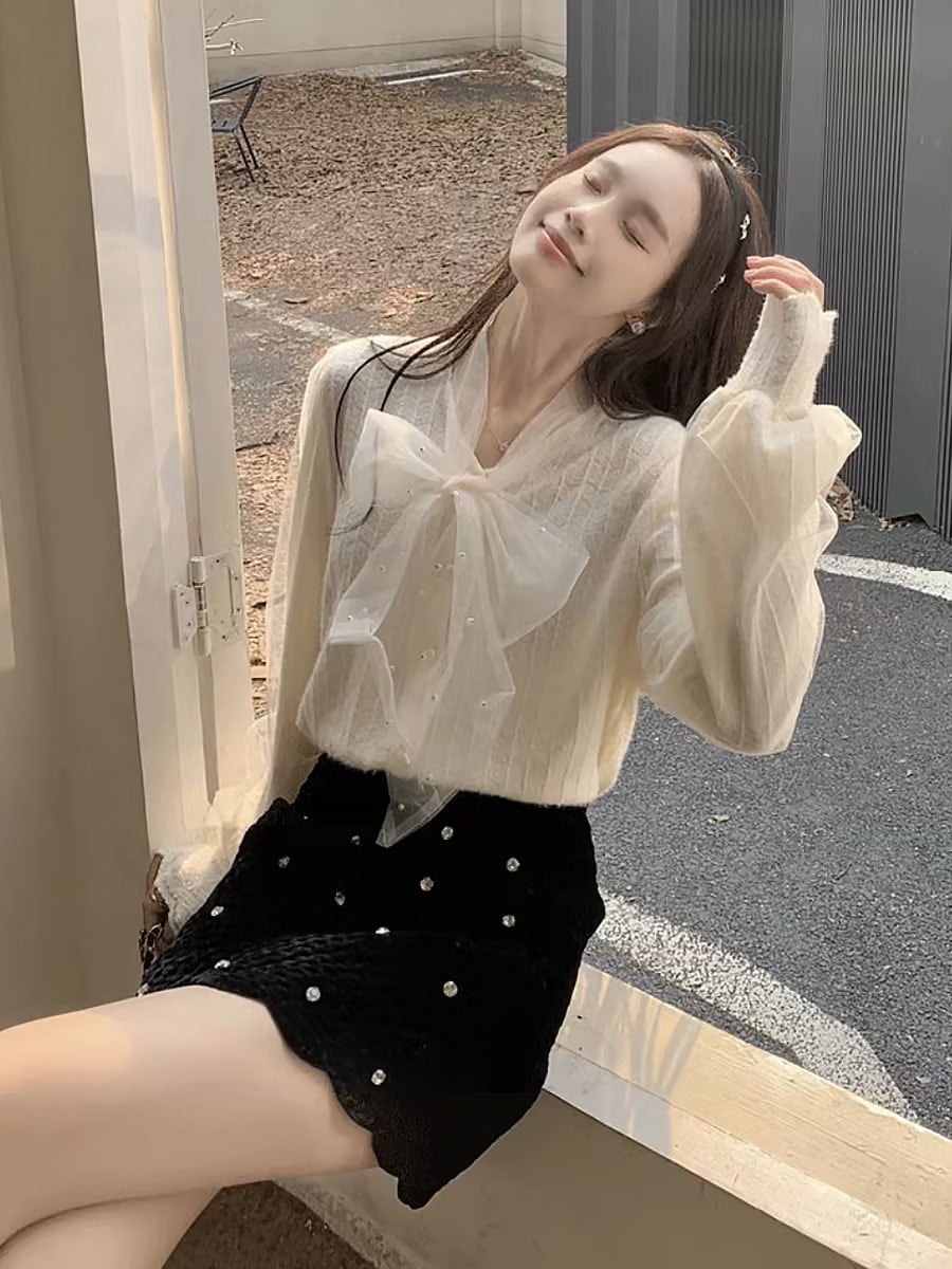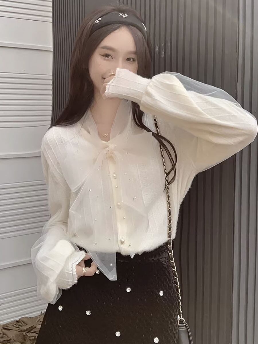 パールビーズ付きリボンタイブラウス オーバーチューブ ダブルチュール ふんわり袖 スカラップ アイボリー アプリコット ホワイト ブラウス パールボタン パフスリーブ ゆったり 袖口大きめリボン リボン 萌袖 長袖 シャツブラウス シック フェミニン カジュアル かわいい 大人可愛い きれいめ シンプル 大人 おしゃれ レディース 学生 デート お出かけ お呼ばれ 着回し モテ 韓国コーデ 韓国ファション