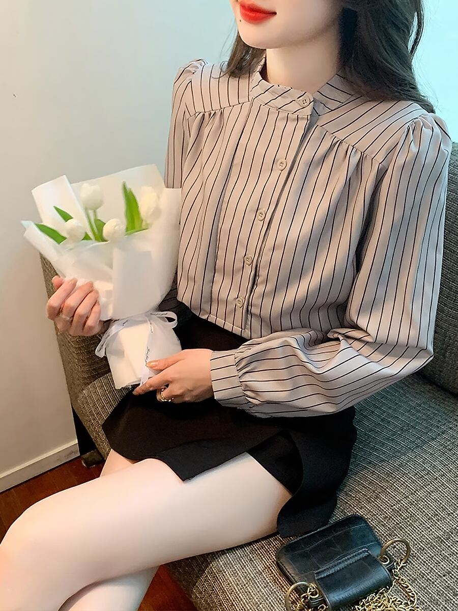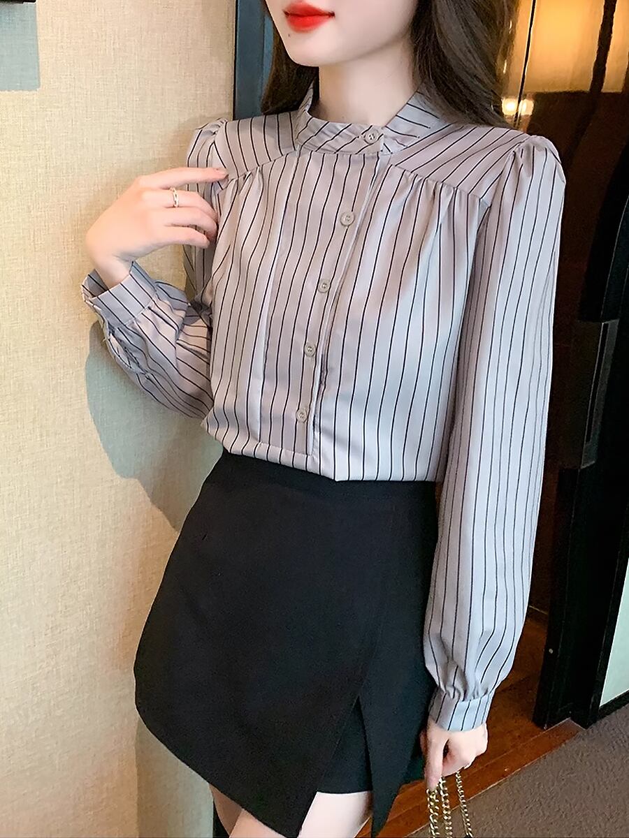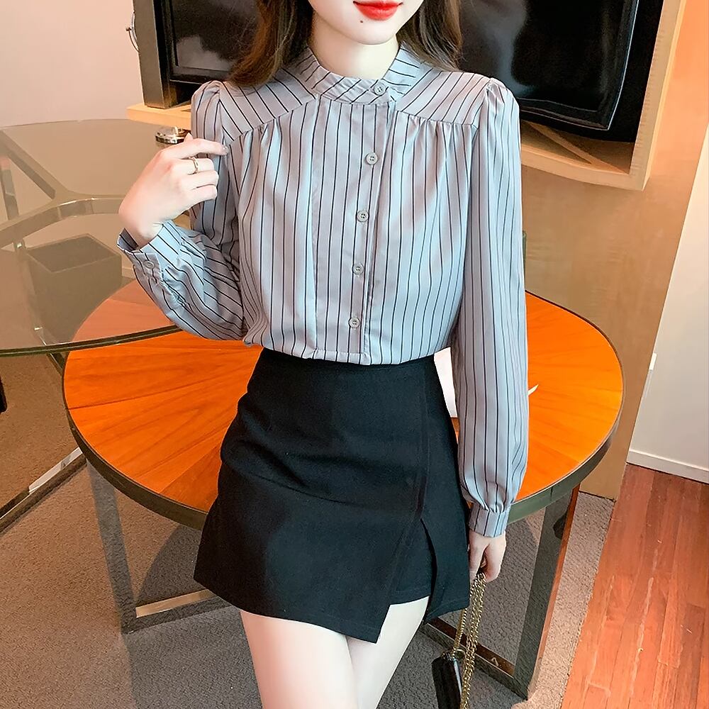 アシンメトリーカラーストライプシャツブラウス ハイカラー スタンドカラー パフスリーブ バルーンスリーブ ストライプ シマシマ 長袖 シャツブラウス サイドウエイカラー 袖あり マニッシュ かわいい 大人可愛い きれいめ カジュアル 清楚 上品 おしゃれ お洒落 大人女子 こなれ感 エレガント モダン イベント レディース 通勤 通学 デート お出かけ 韓国コーデ 韓国ファッション グレー 灰色