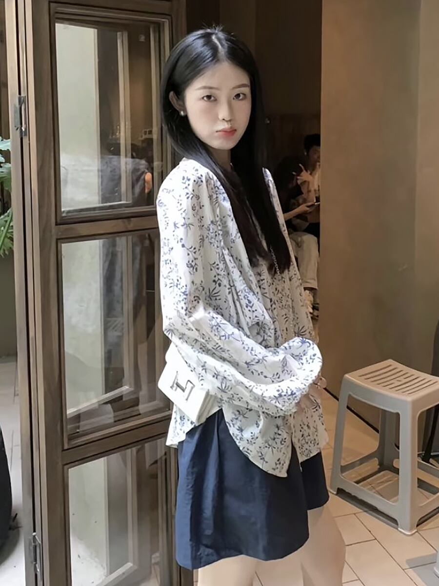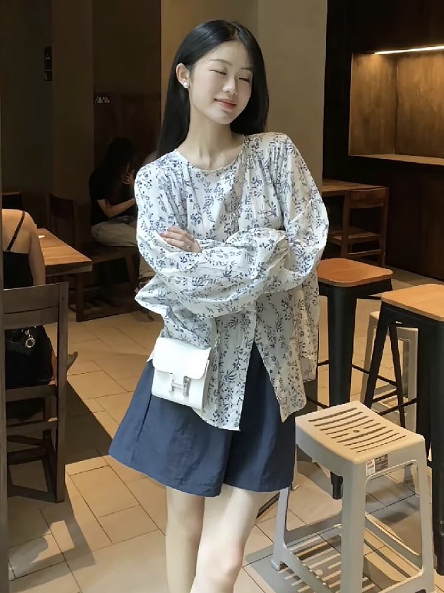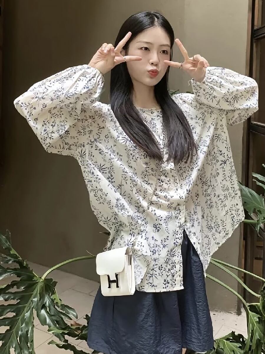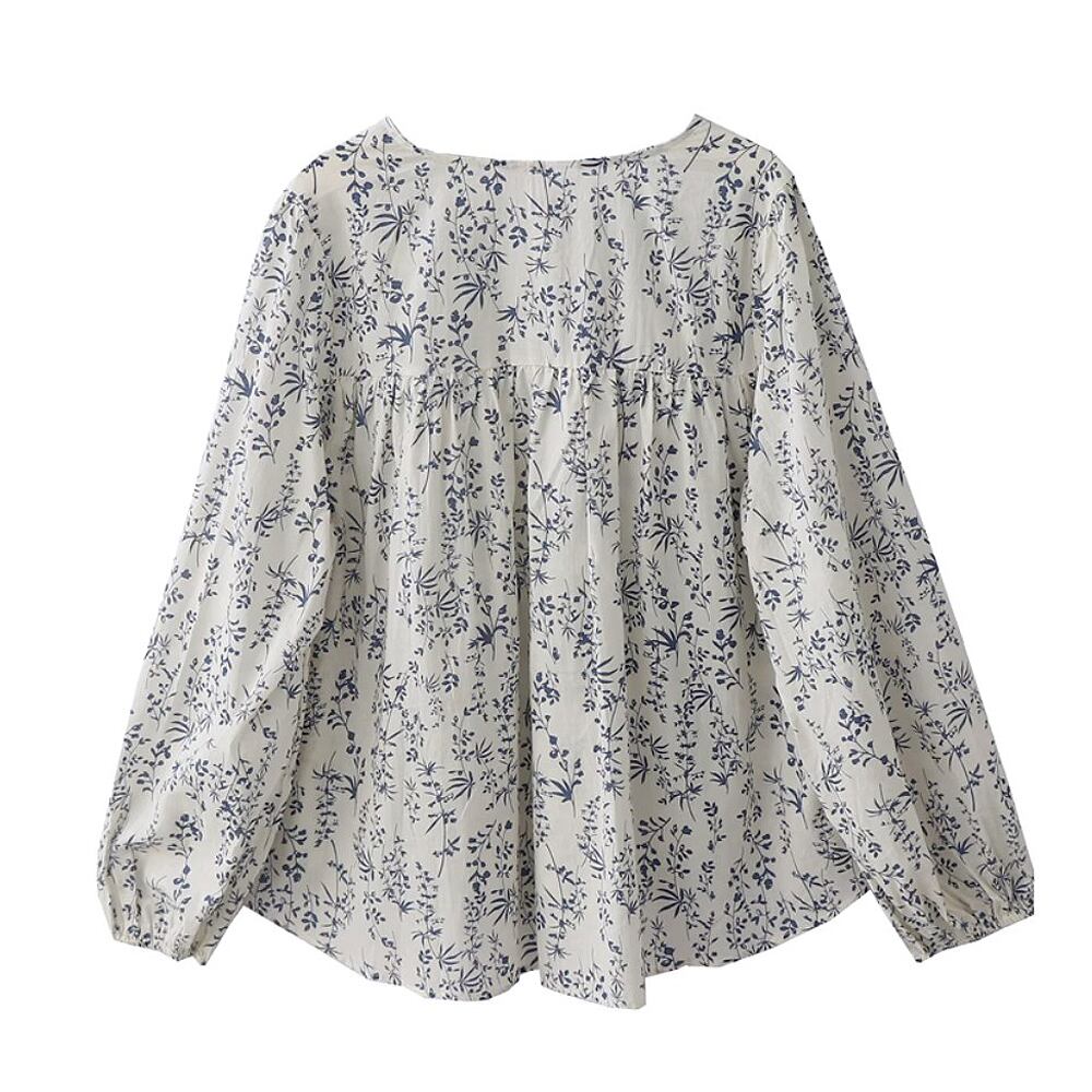 ボタニカルプリントラウンドネックシャツブラウス ラウンドネック パフスリーブ バルーンスリーブ 花柄 小花柄 長袖 シャツブラウス Aライン 袖あり シンプル レトロ アジアン エスニック かわいい 大人可愛い きれいめ カジュアル 清楚 上品 おしゃれ お洒落 大人女子 こなれ感 エレガント モダン イベント レディース 通勤 通学 デート お出かけ 韓国コーデ 韓国ファッション ブルー