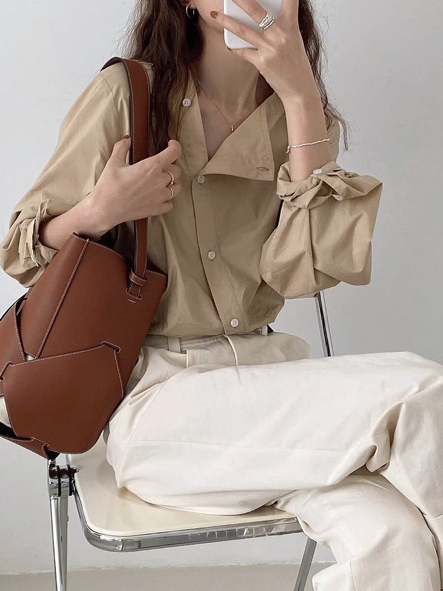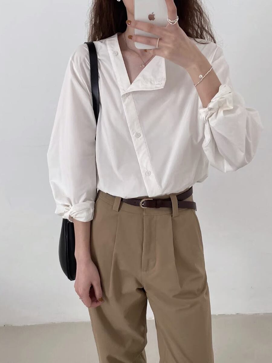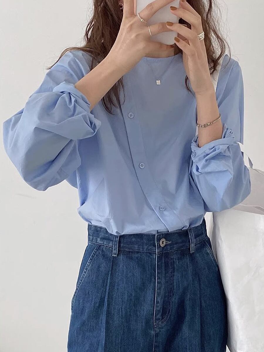 全3色 ノーカラーアシンメトリーシャツブラウス 斜め合わせ 斜めボタン 非対称 ブラウス スクエアネック ブラウス 長袖 ボリューム袖 マニッシュ ボーイッシュ ガーリー カジュアル 大人可愛い きれいめ 上品 おしゃれ レトロ 大人女子 こなれ感 ラブリー キュート 個性的 エレガント モダン 主役級 存在感 韓国コーデ 韓国ファッション アイボリー カーキ ブルー