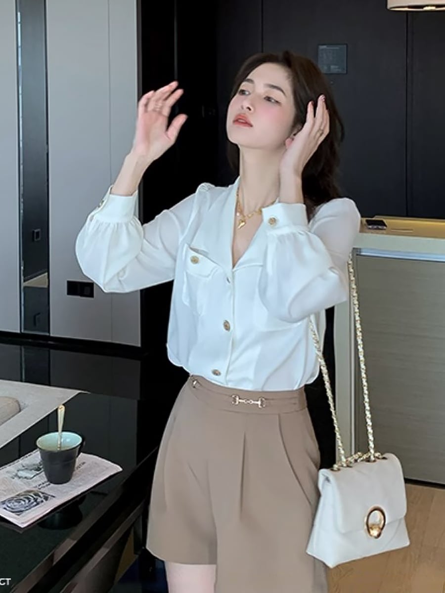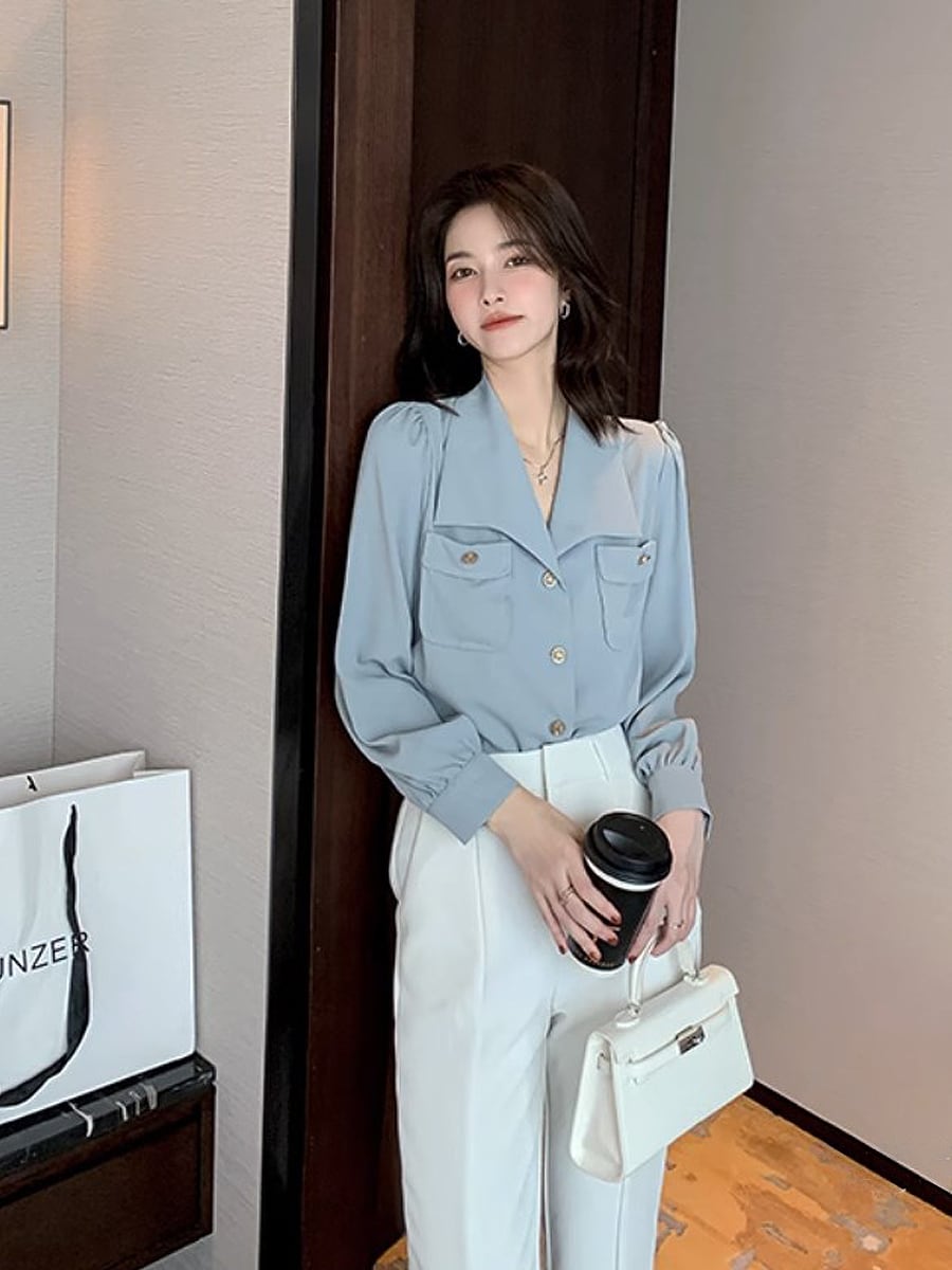 全2色 飾りボタンポケット付きシフォンシャツブラウス 飾りボタン シフォン ブラウス Vネック 長袖 ボリューム袖 きちんと感 オフィスコーデ 通勤 懇親会 大人可愛い きれいめ 上品 おしゃれ レトロ 大人女子 こなれ感 ラブリー 個性的 エレガント モダン 主役級 存在感 韓国コーデ 韓国ファッション くすみブルー ブルー 青 ホワイト 白 くすみカラー 大人カラー