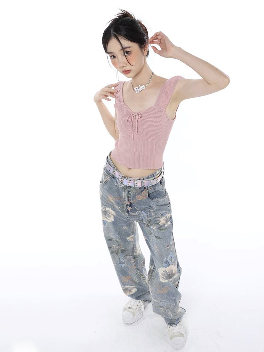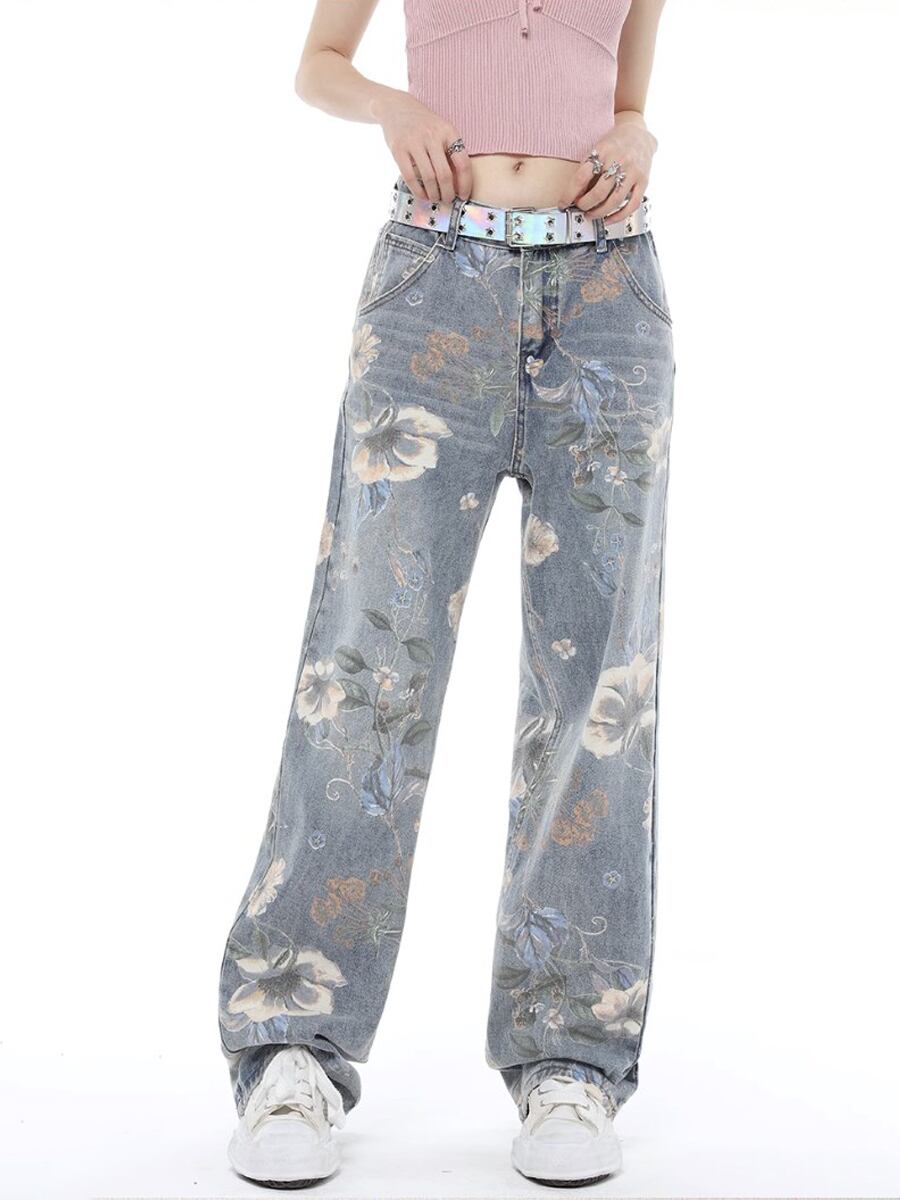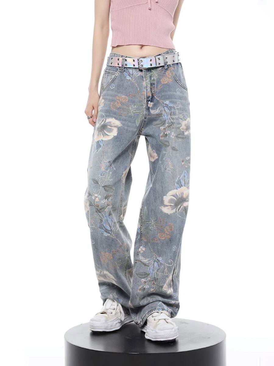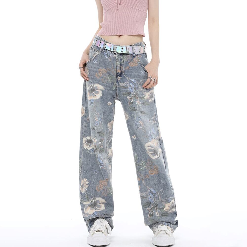 花柄プリントデニムパンツ フラワープリント 花柄 ハイウエスト ワイド ロング デニム カラーデニム デニムパンツ かわいい 大人可愛い シンプル カジュアル おしゃれ お洒落 かっこいい こなれ感 ラフ メンズライク ボーイッシュ ガーリー 春 夏 秋 冬 オールシーズン 学生 通学 デートお出かけ 休日 旅行 着回し 普段使い コーデ スタイル 楽ちん 大きいサイズ ラージサイズ 韓国コーデ 韓国ファッション ブルー