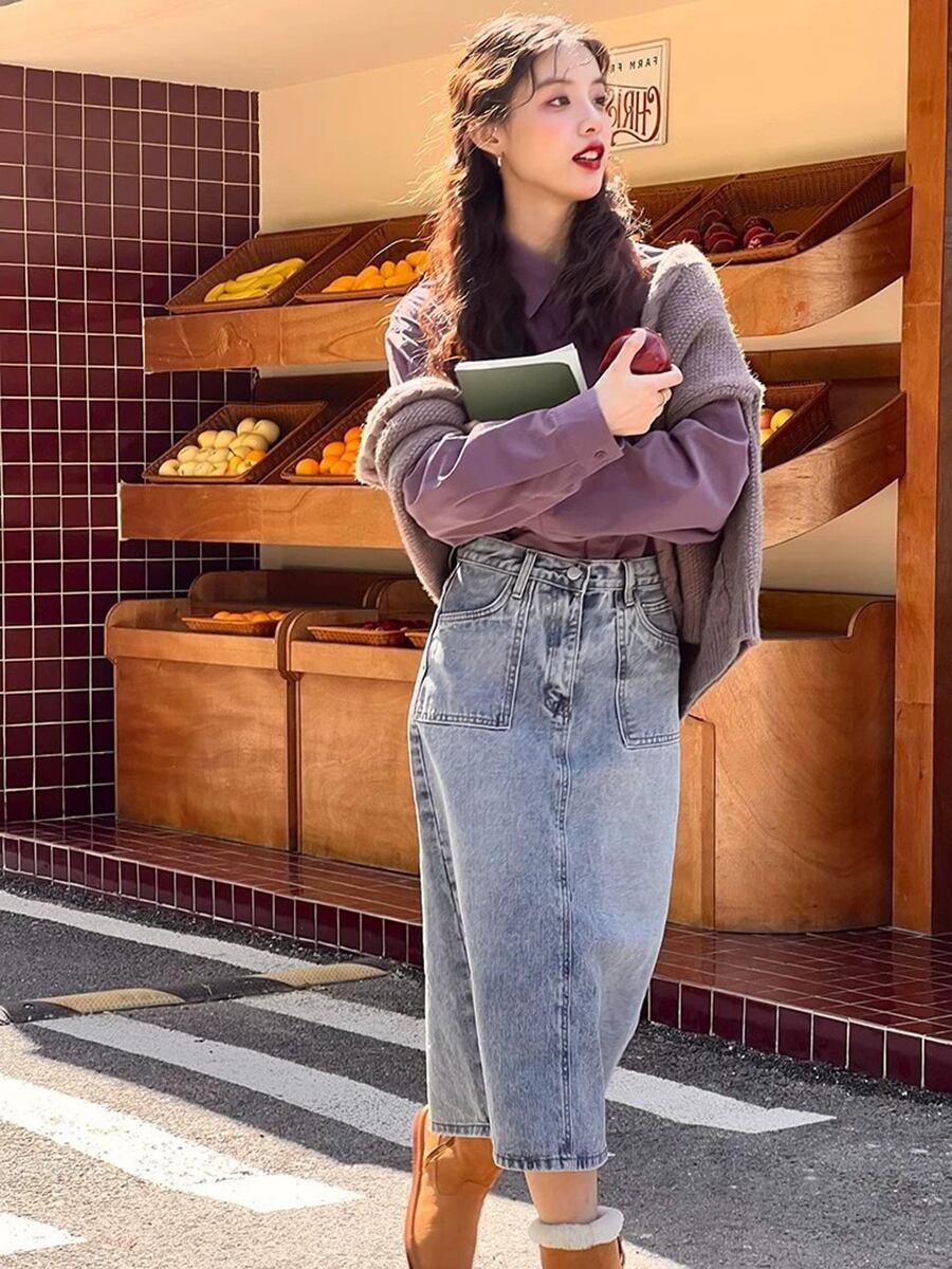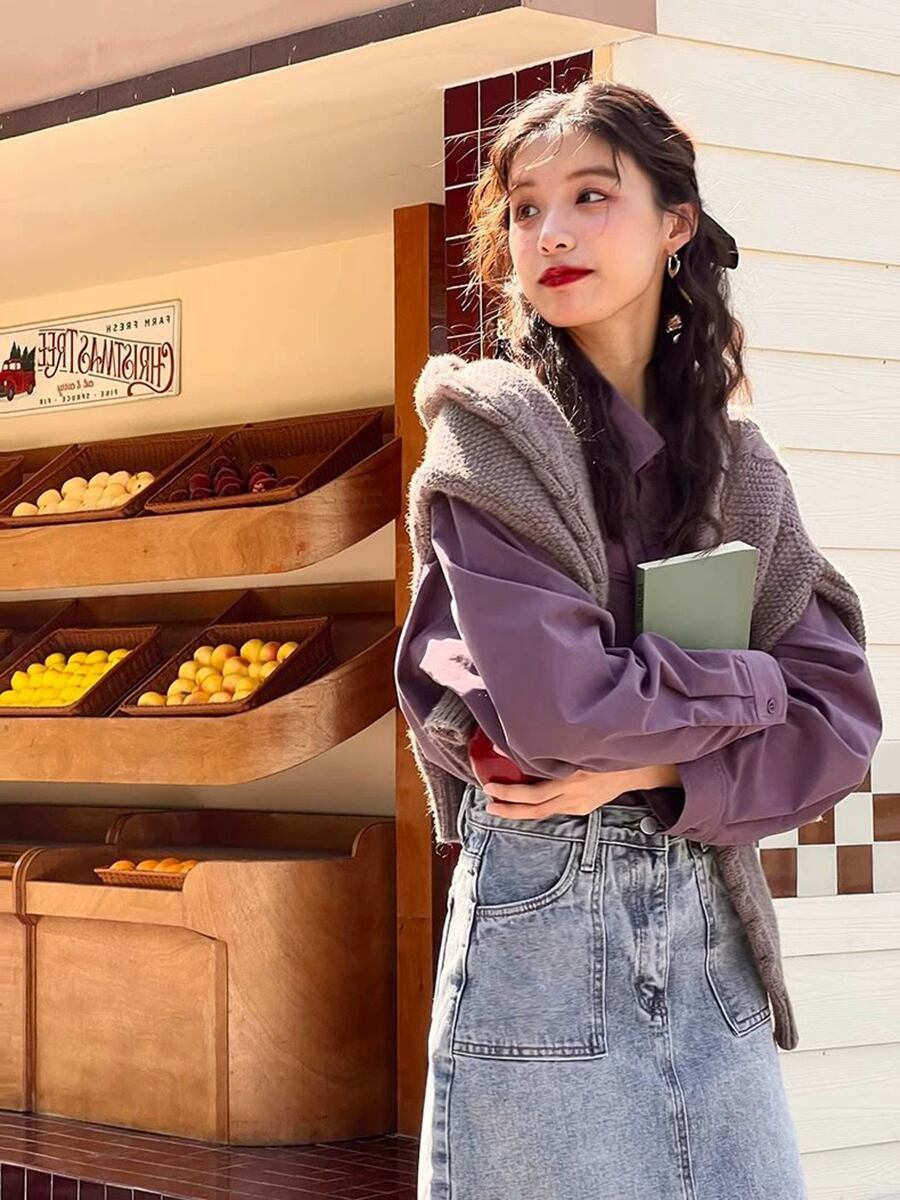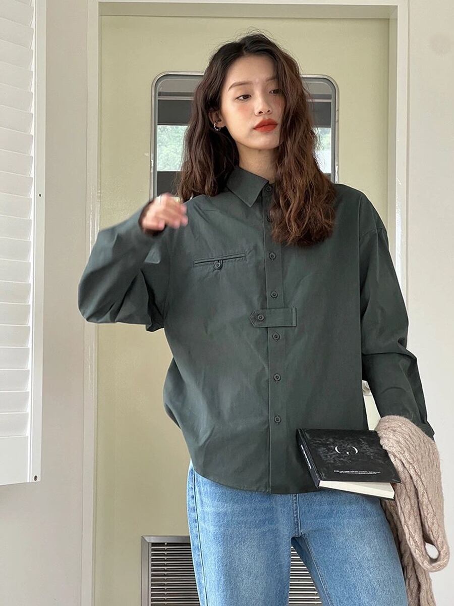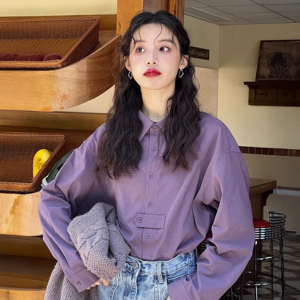 全2色 トップス 長袖シャツシャツ ベーシック パープル 紫 バイオレット ラベンダー グリーン 緑 かわいい 大人可愛い きれいめ ナチュラル シンプル カジュアル 大人 ざっくり おしゃれ 大人女子 こなれ感 キュート 主役級 存在感 無地 春 秋 冬 レディース オフィス ビジネス OL 通勤 学生 通学 デート お出かけ 公園デビュー 女子会 休日 旅行 着回し 普段使い 重ね着 韓国 オルチャン 韓国コーデ スタイル くすみカラー 大人カラー
