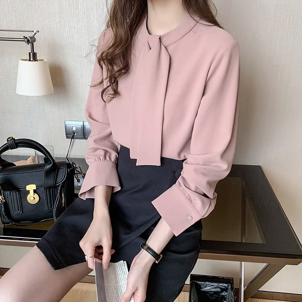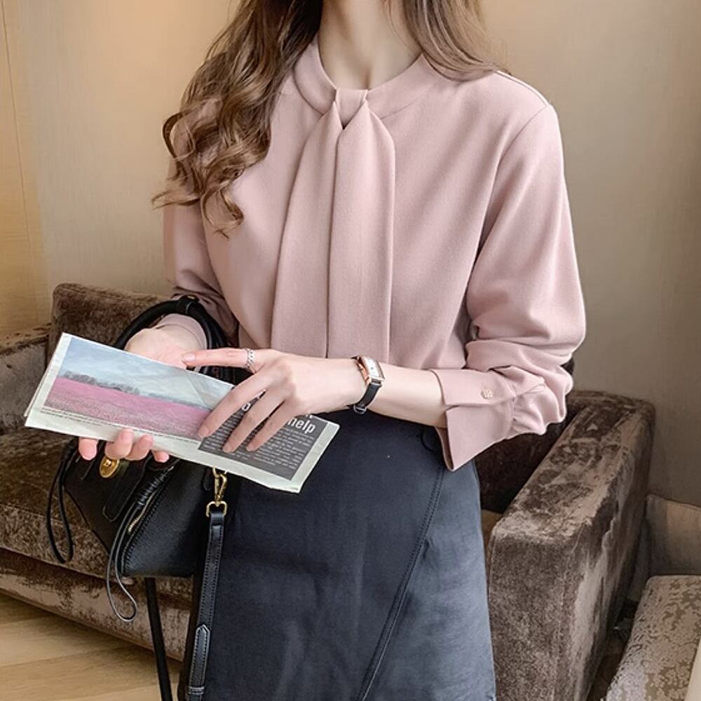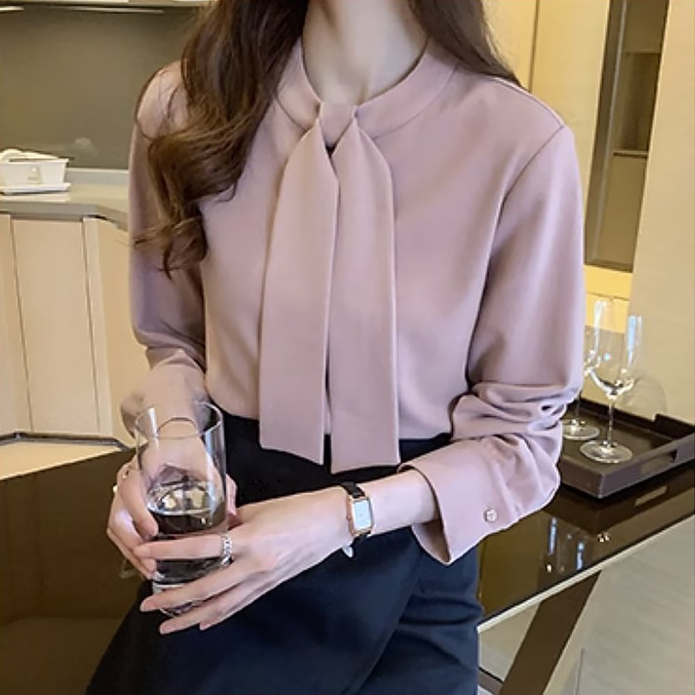 フェミニンな大人カラー、くすみピンクのボウタイブラウスです。
