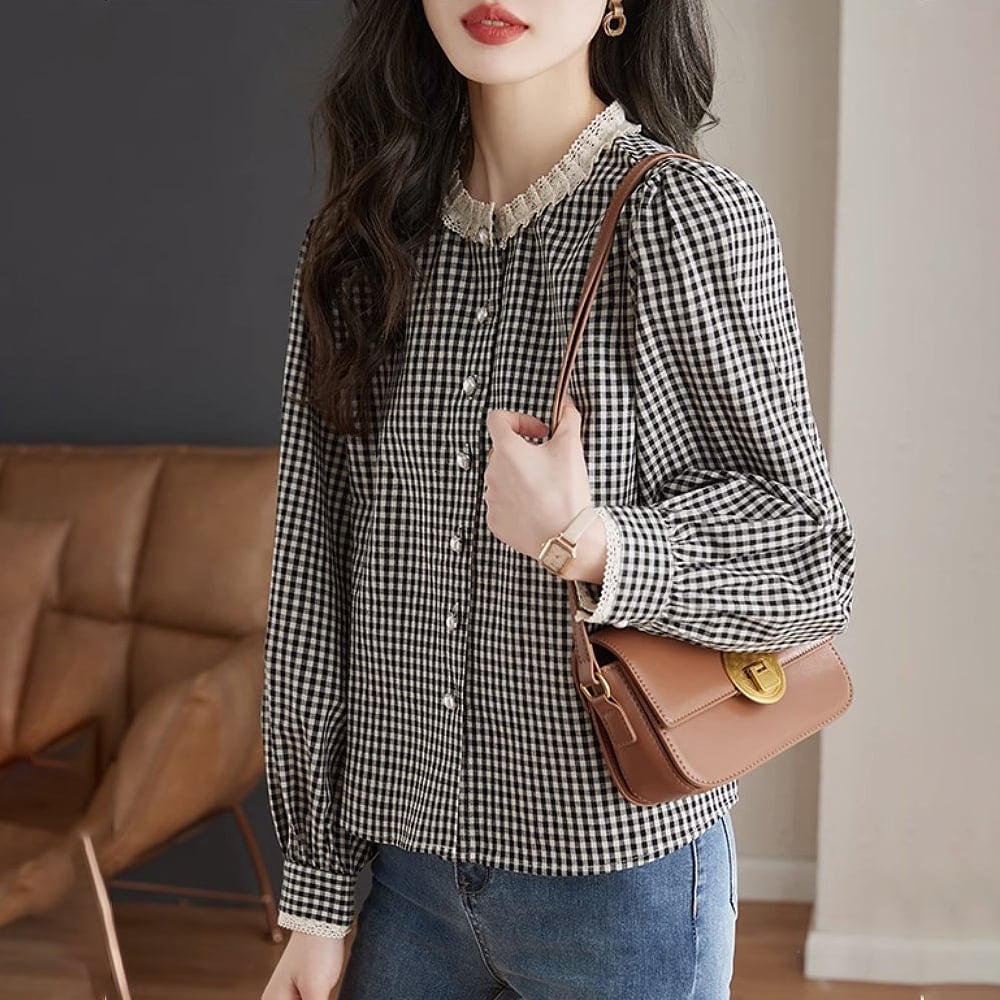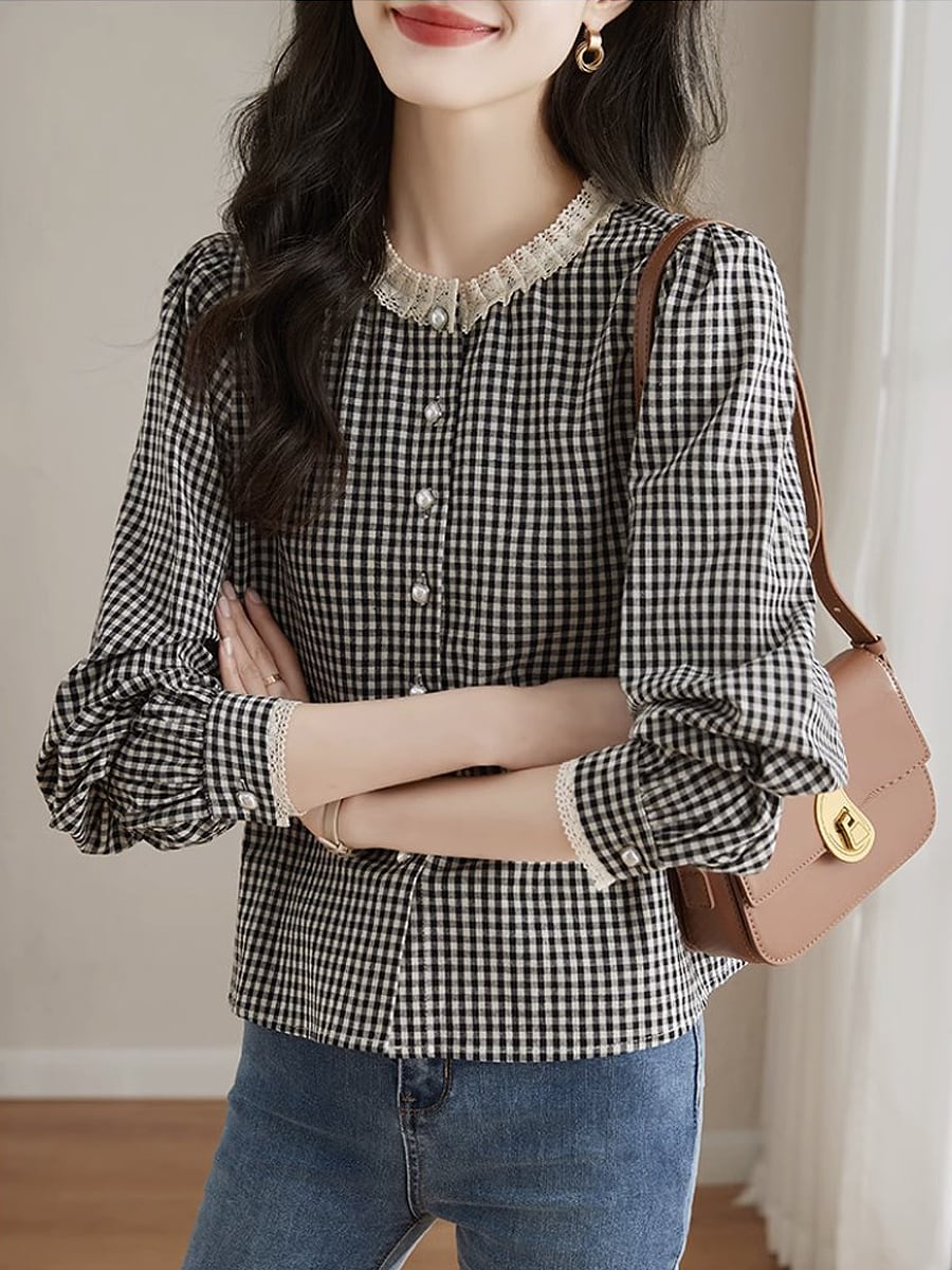 ギンガムチェックパールボタンブラウス シャツ ブラウス 長袖 ボリューム袖 ふんわり袖 パフスリーブ モノトーンチェック 白黒 ギンガムチェック パールボタン 飾りボタン 襟レース レース飾り レース 萌袖 かわいい 大人可愛い きれいめ シンプル カジュアル 上品 おしゃれ かっこいい レトロ こなれ感 ラブリー キュート 個性的 モード系 エレガント モダン 主役級 存在感 抜け感 柄 レディース お出かけ 女子会 韓国コーデ 韓国ファション モノクロ