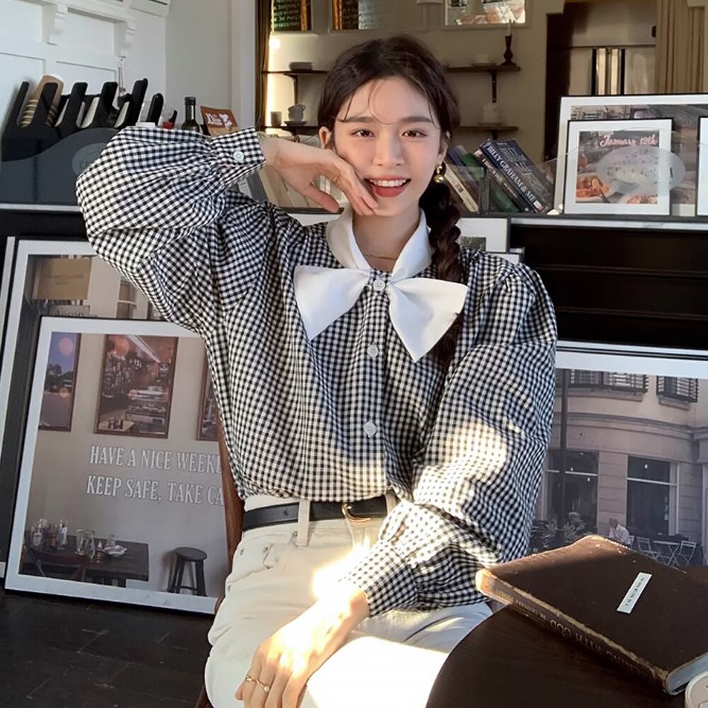 ギンガムチェックホワイトリボンブラウス シャツ ブラウス 長袖 ボリューム袖 ふんわり袖 パフスリーブ モノトーンチェック 白黒 ギンガムチェック パールボタン 飾りボタン リボンラペル 萌袖 かわいい 大人可愛い きれいめ シンプル カジュアル 上品 おしゃれ かっこいい レトロ こなれ感 ラブリー キュート 個性的 モード系 エレガント モダン 主役級 存在感 抜け感 柄 レディース お出かけ 女子会 韓国コーデ 韓国ファション モノクロ