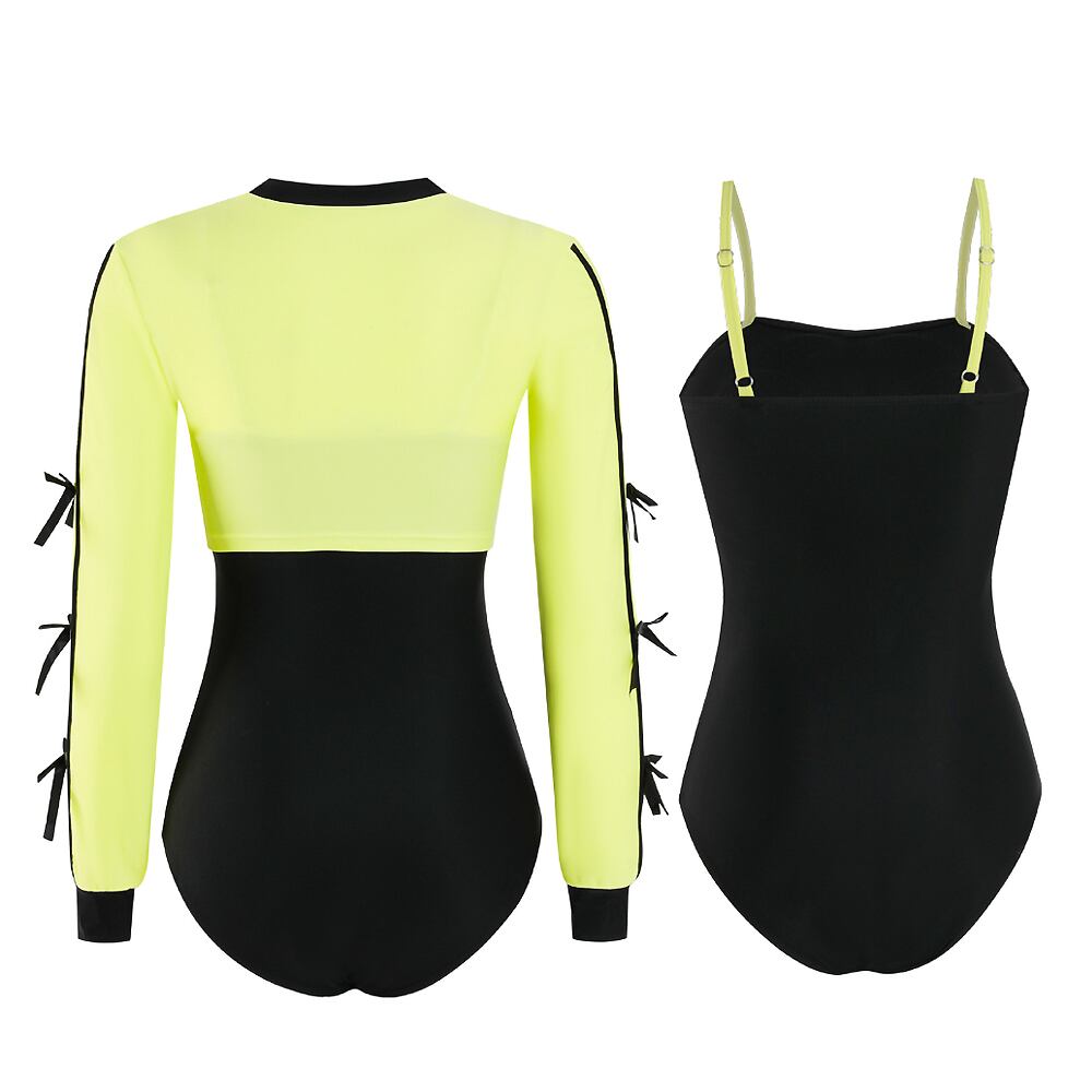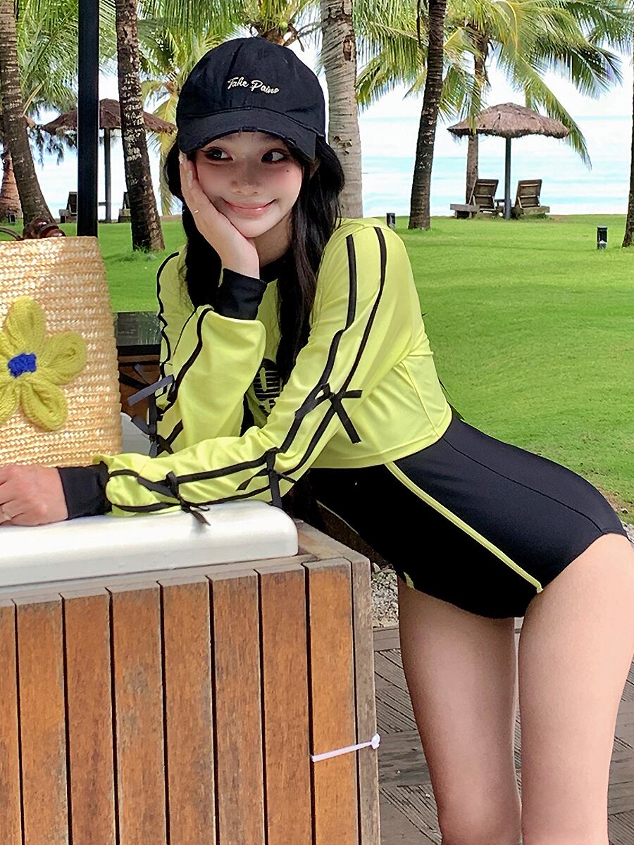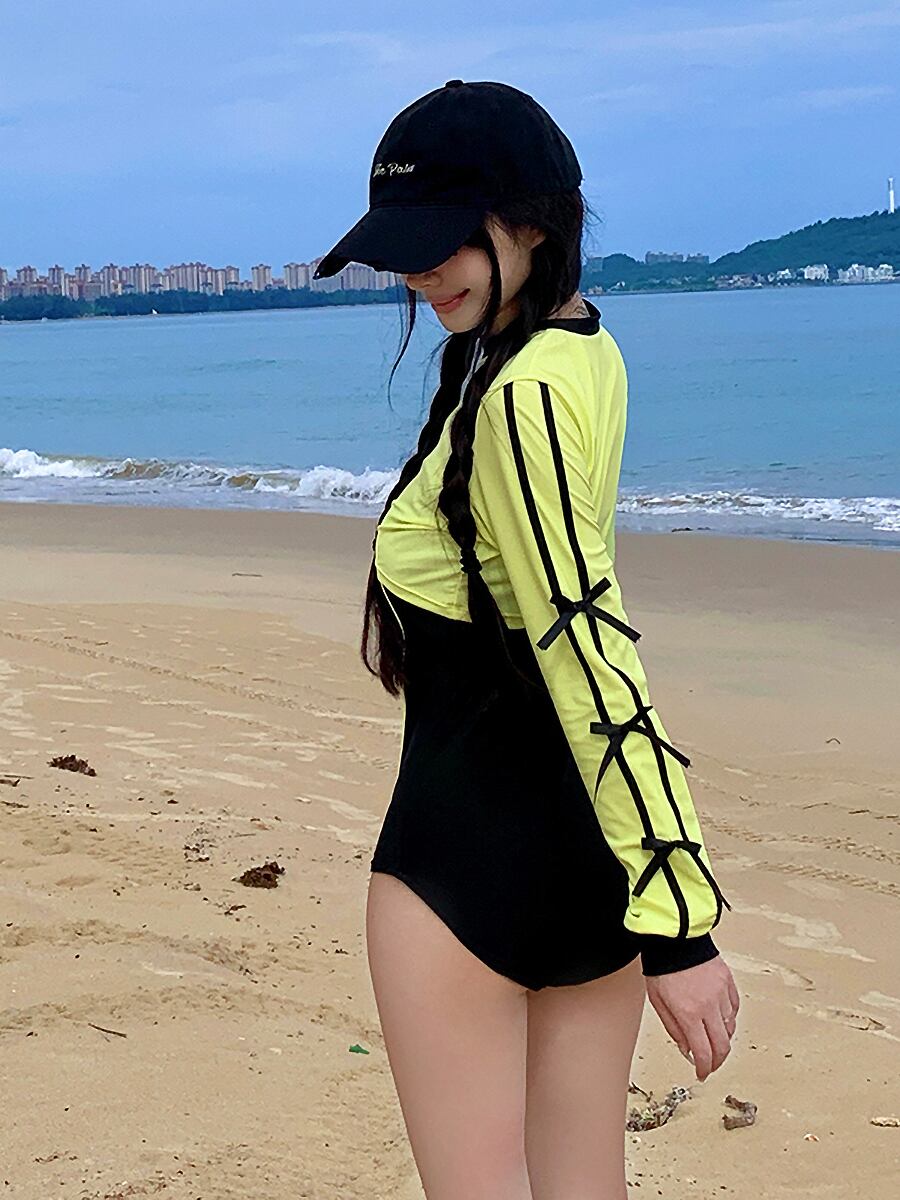 2点セット 水着 水着ワンピ ワンピース水着 数字ロゴライン入りワンピース水着+長袖ラッシュガード 袖リボン ブラック 黒 イエロー 黄色 スポーティ スポーツ ダイビング バイカラー 配色 リボン ラッシュガード 水着ワンピース クロップド クロップド丈 ガーリー フェミニン かわいい 日焼け防止 体型カバー パッド付き ノンワイヤー セット かわいい 大人可愛い きれいめ おしゃれ スタイリッシュ 美脚 脚長 韓国コーデ 韓国ファション
