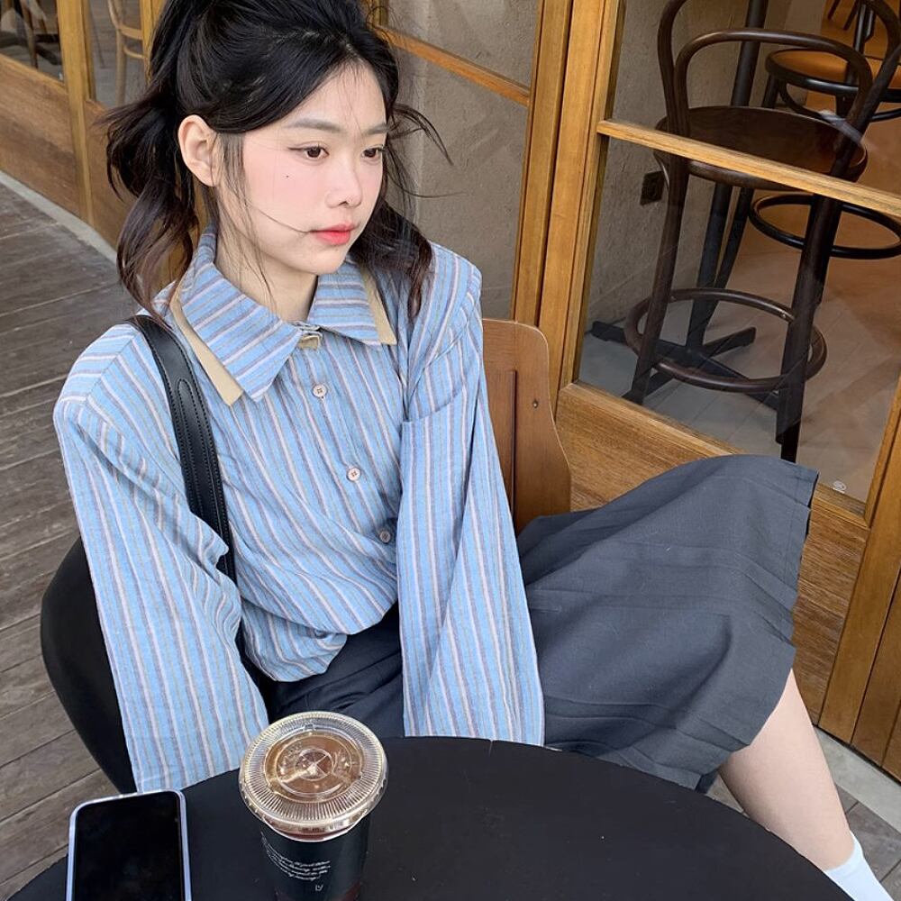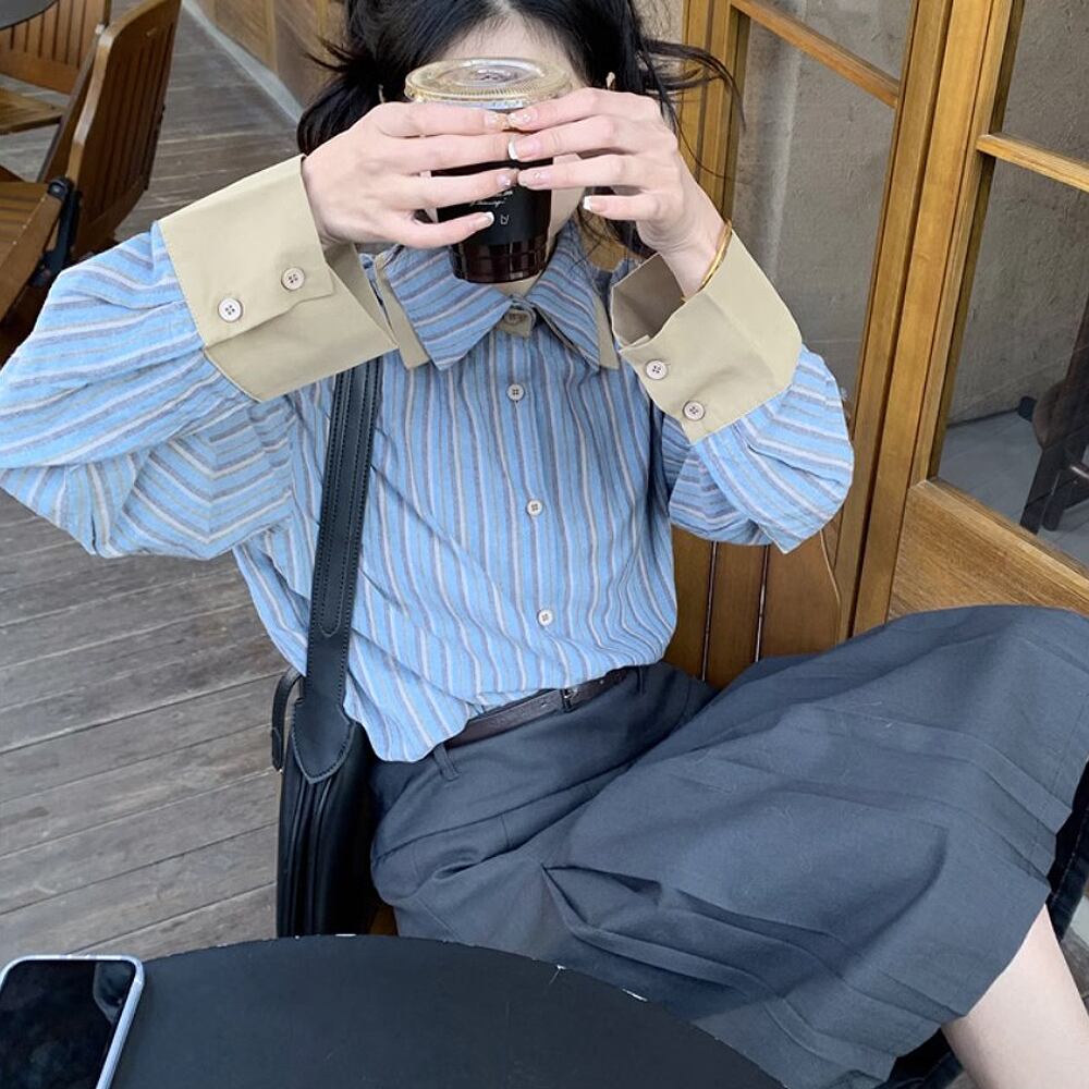 ダブルカラーカラーストライプシャツブラウス 袖裏別カラー ストライプシャツ 重ね衿 長袖 ストライプ コントラストカラー ビジネスコーデ フレンチチック シャツ 袖あり オフィスコーデ マニッシュ ボーイッシュ 大人可愛い きれいめ シンプル カジュアル シャツ ブラウス 上品 おしゃれ 大人女子 こなれ感 レディース オフィス 通勤 通学 デート お出かけ 着回し 普段使い 重ね着 韓国 オルチャン ゆったり アイスブルー 韓国コーデ 韓国ファション マルチカラー