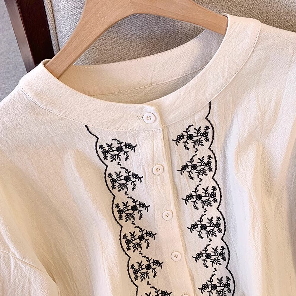 オリエンタル刺繍オーバーサイズフリルシャツブラウス アプリコット アイボリー ラウンドネック 襟なし シャツブラウス 長袖 トップス ミディアム丈 ボリュームスリーブ ボリューム袖 刺繍 花柄 かわいい 大人可愛い シンプル カジュアル きれいめ 上品 おしゃれ お洒落 こなれ感 無地 春 秋 レディース 女性用 通勤 学生 通学 デート 着回し 重ね着 普段使い 韓国系 オルチャン 大きめ ゆったり 韓国コーデ 韓国ファッション
