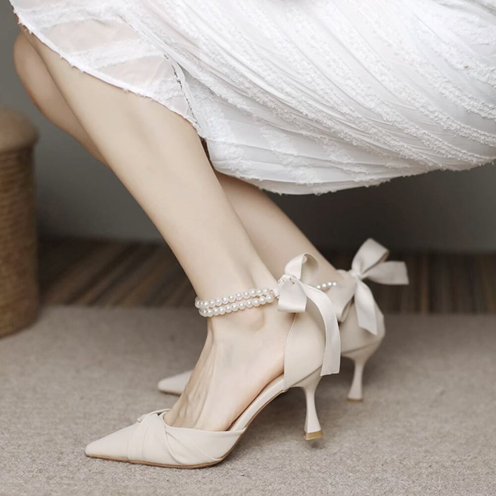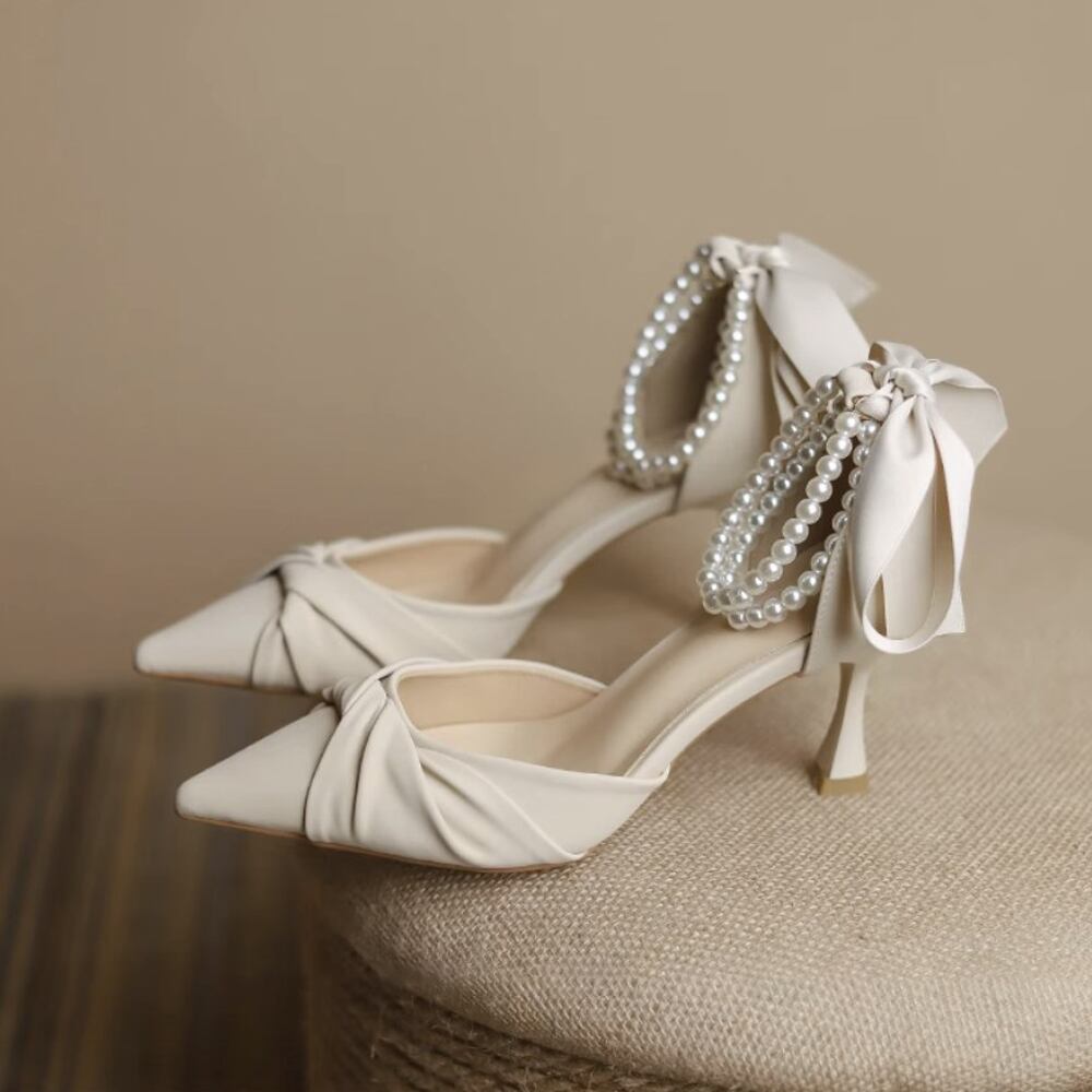 パールのストラップと後ろの大きめリボンが上品で可愛らしいハイヒールです。