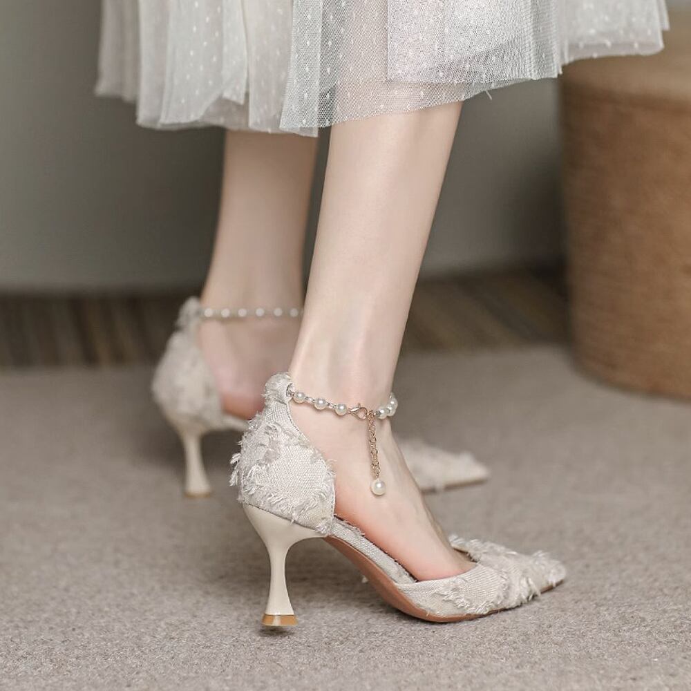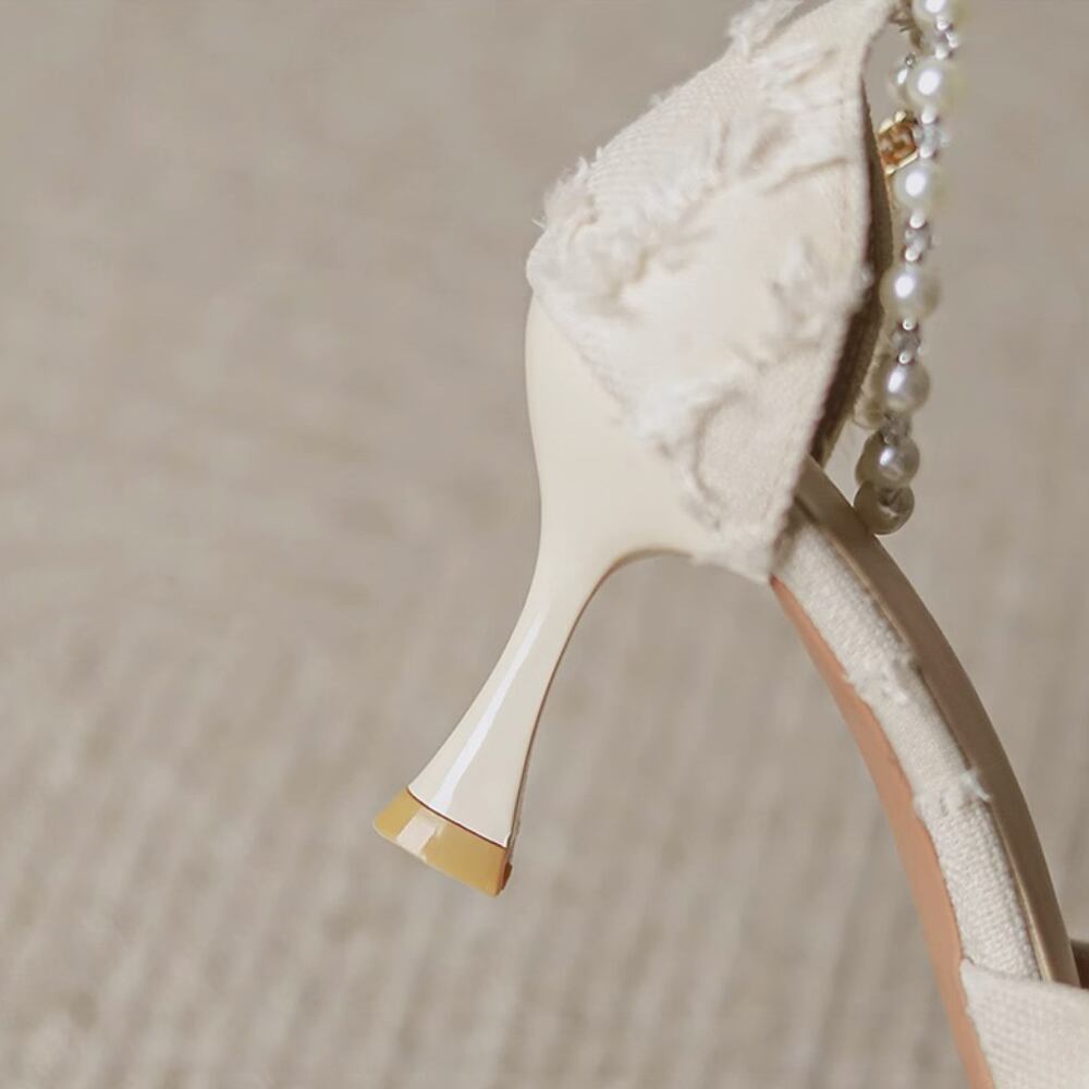 フリンジジャガードの質感とパールのストラップが印象的で上品で可愛らしいハイヒールです。