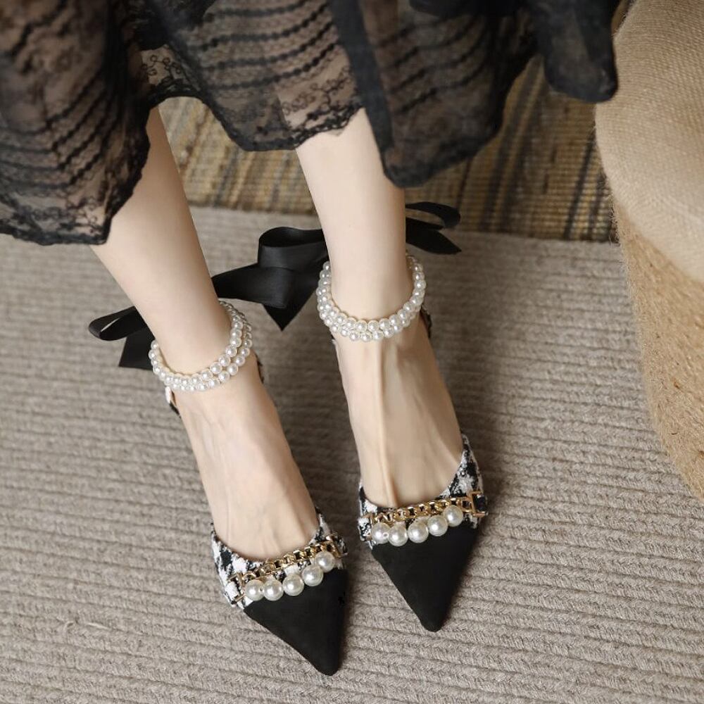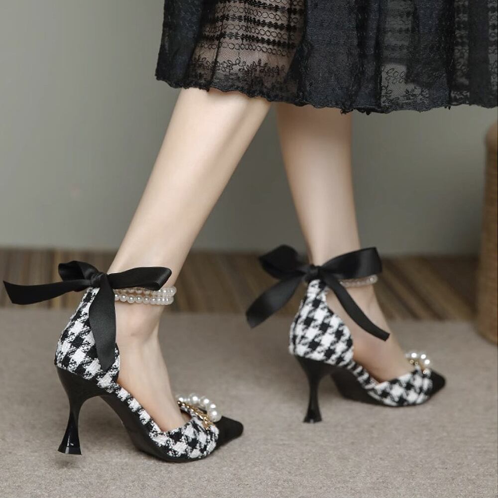 ヒール3種 選べる高さ 千鳥格子柄 ハイヒール ポインテッド バックリボン 7cmヒール 5cmヒール 3cmヒール パールストラップ 歩きやすい 履きやすい かわいい 大人可愛い きれいめ シンプル 大人 上品 おしゃれ お洒落 かっこいい レトロ フォーマル エレガント きちんと感 クール モード系 セクシー モダン 主役級 存在感 こなれ感 とろみ感 結婚式 成人式 入学式 入園式 卒業式 卒園式 謝恩会 韓国コーデ 韓国ファション ブラック