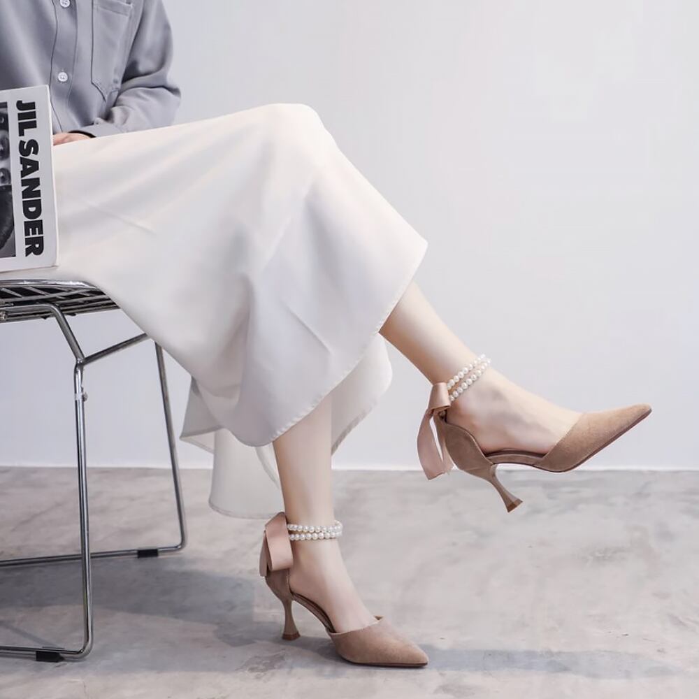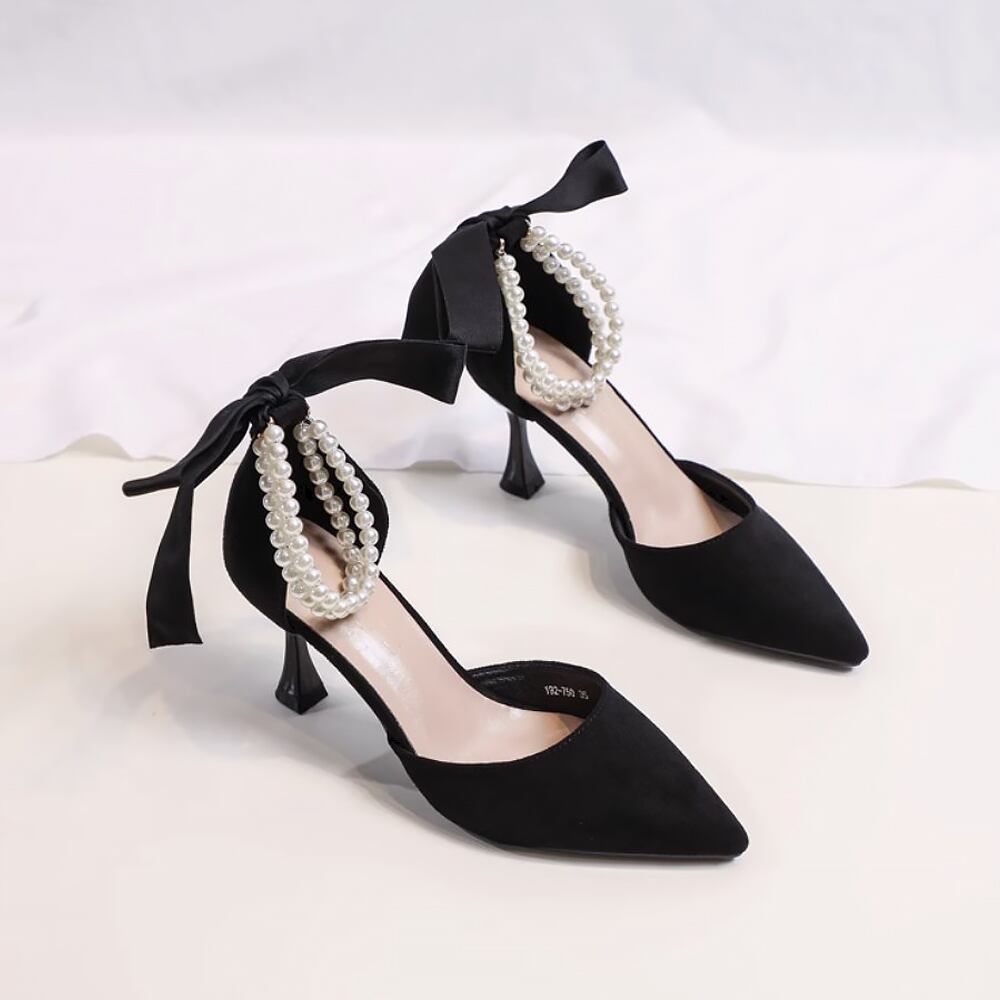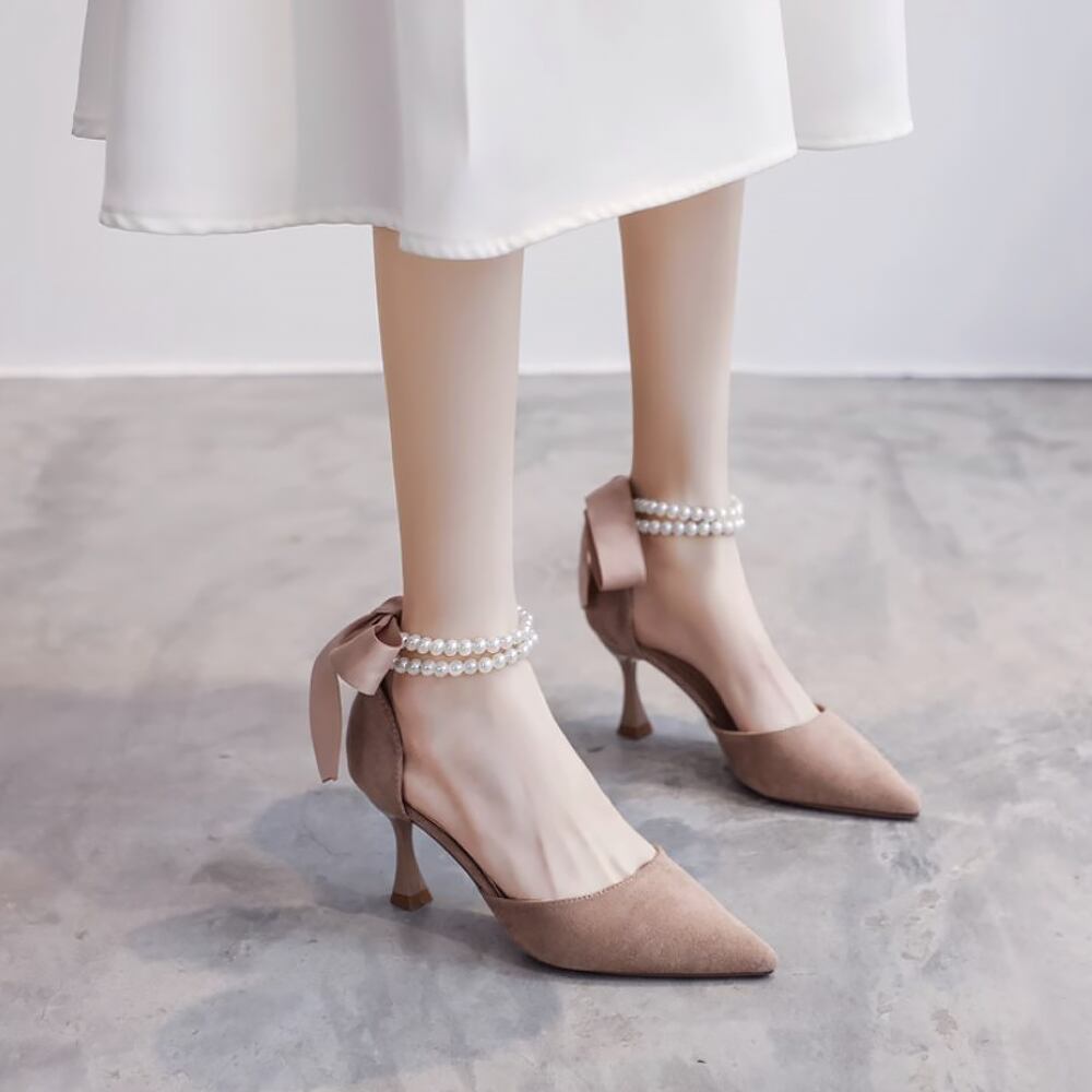 スエードのパールストラップのハイヒールです。後ろにリボンがついて大人可愛いアイテムで、上品で気品があるハイヒールです。